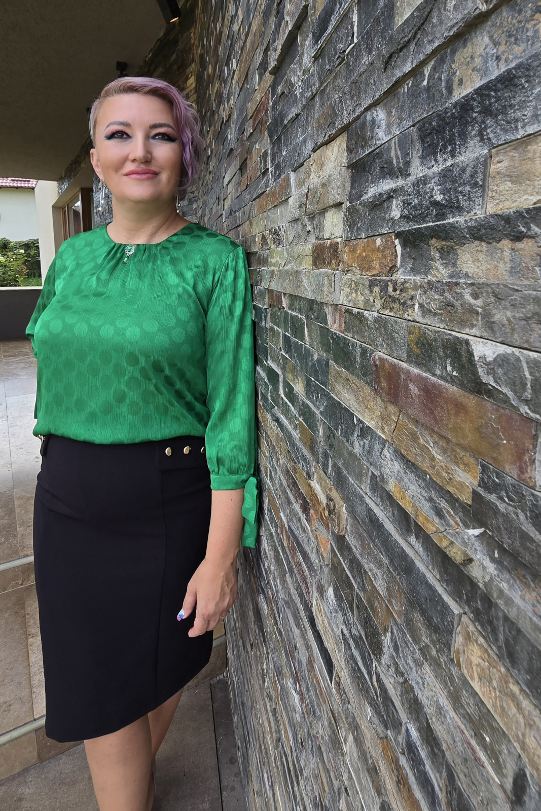 Bluza din voal cu accesoriu tip brosa la gat. Croi drept, lejer. Inchidere cu nasture in spate la decolteu.