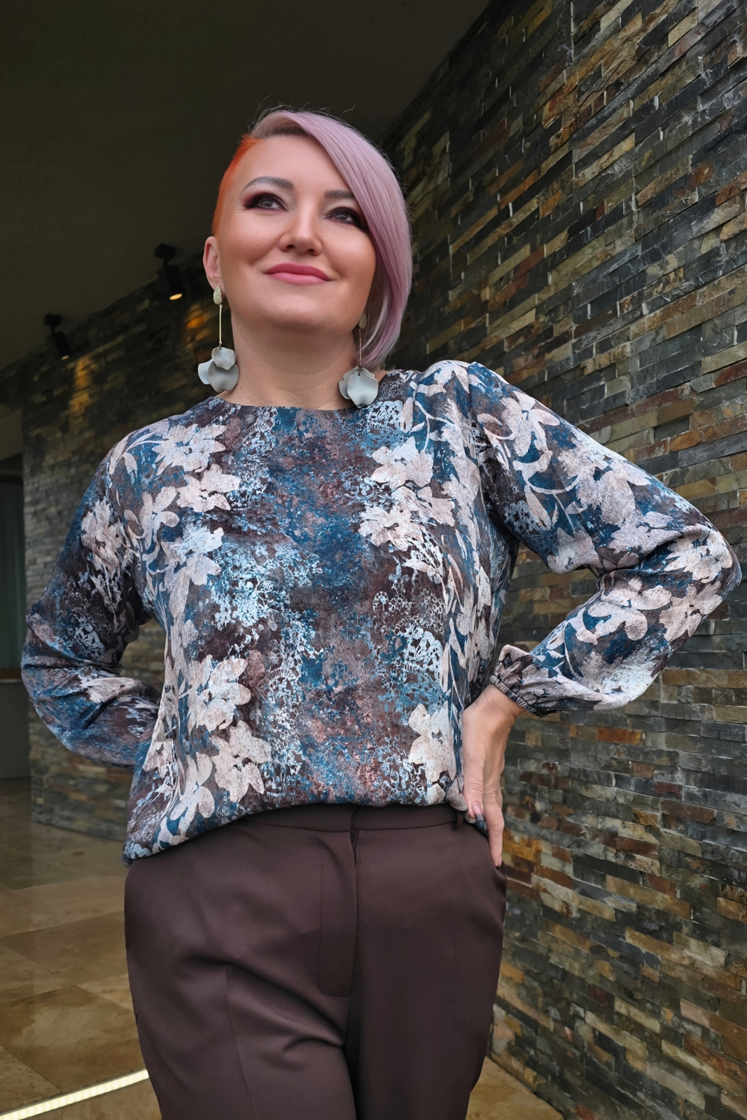 Bluza eleganta din material imprimat. Decolteu rotund la baza gatului.