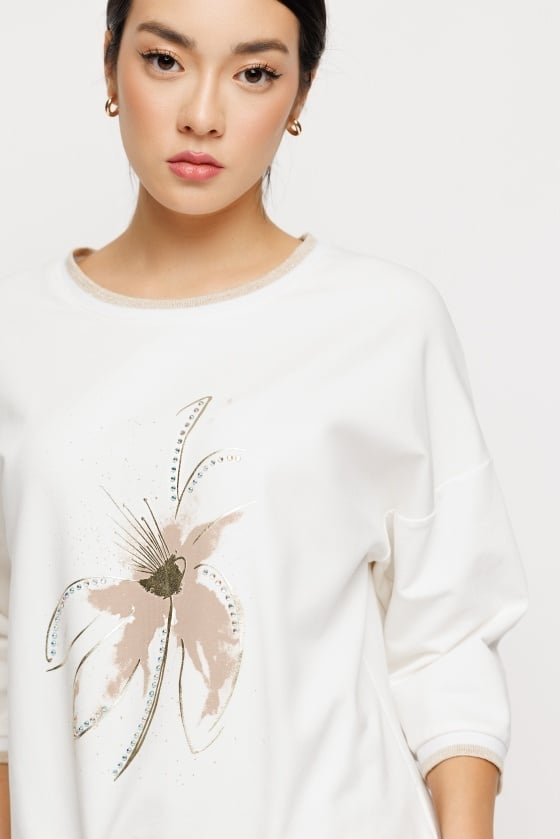 Bluza lejera din tesatura tricotata uni, cu garnituri in contrast, terminatia reglabila cu siret si print cu strasuri.