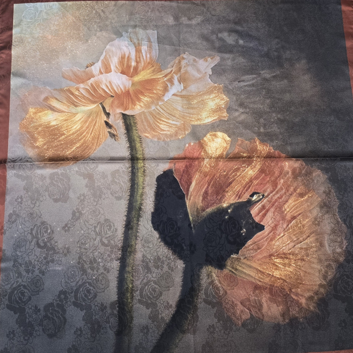 Esarfa patrata din matase naturala grosa cu imprimeu diferit pe fiecare parte.