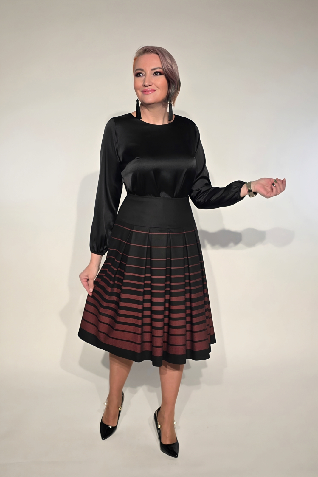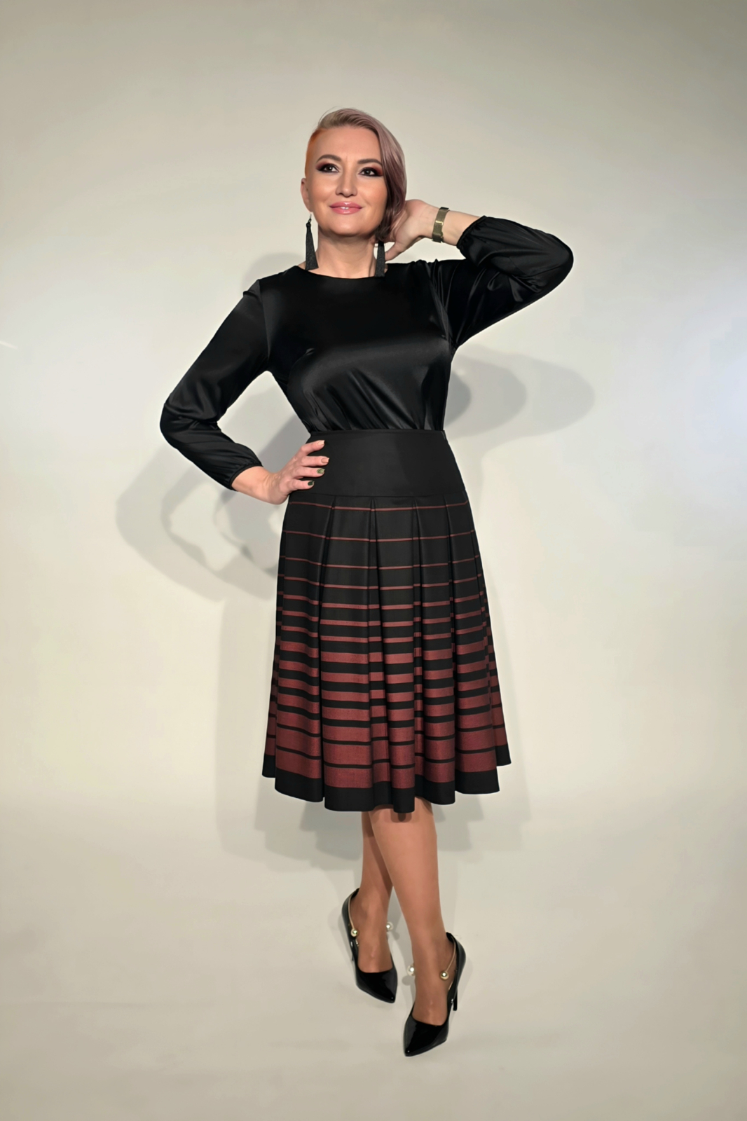 Fusta neagră midi cu pliuri din stofă este definiția eleganței clasice reinterpretate modern.