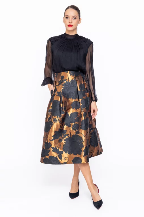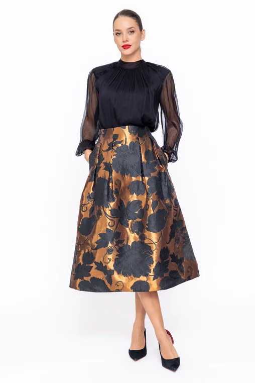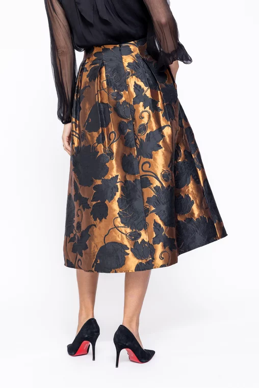 Fusta midi elegantă se remarcă prin pliurile adânci decorative care îi conferă un aspect sofisticat și feminin. Este prevăzută cu buzunare laterale funcționale, oferind atât stil, cât și practicitate, și se închide la spate cu fermoar ascuns pentru un finisaj îngrijit și elegant, fiind alegerea perfectă pentru ținute rafinate de zi sau de seară.