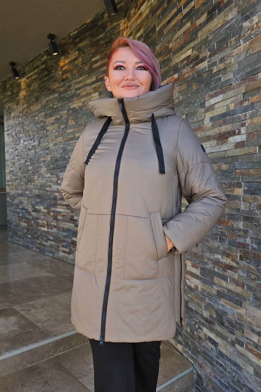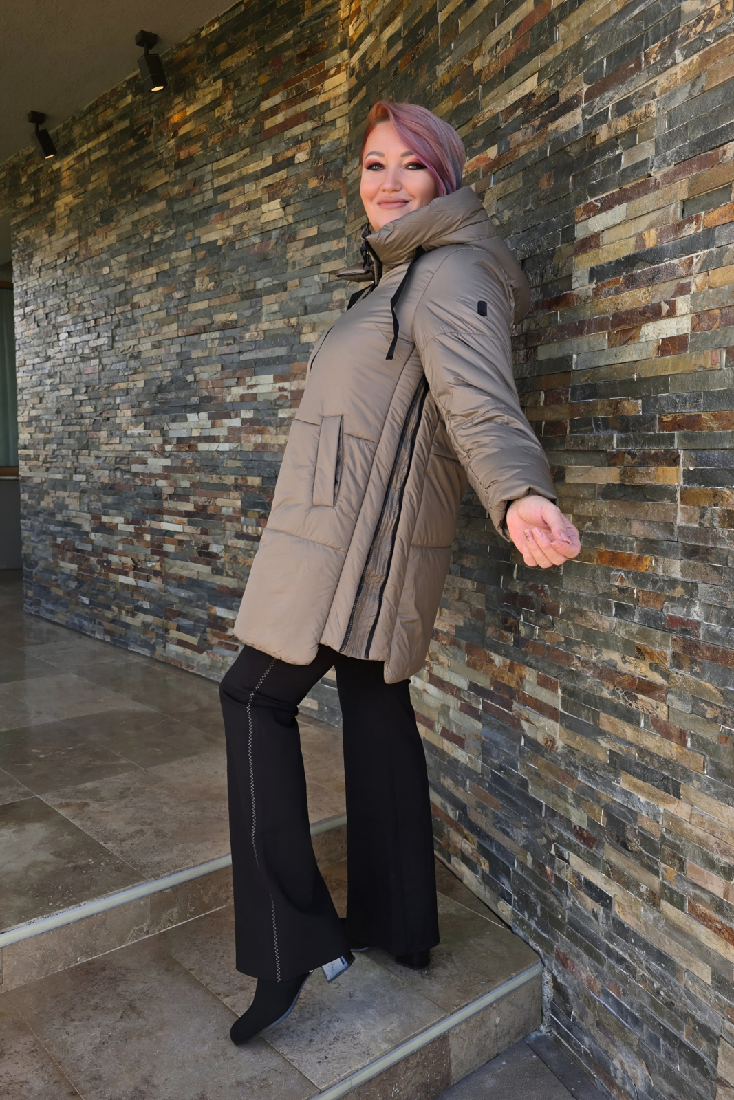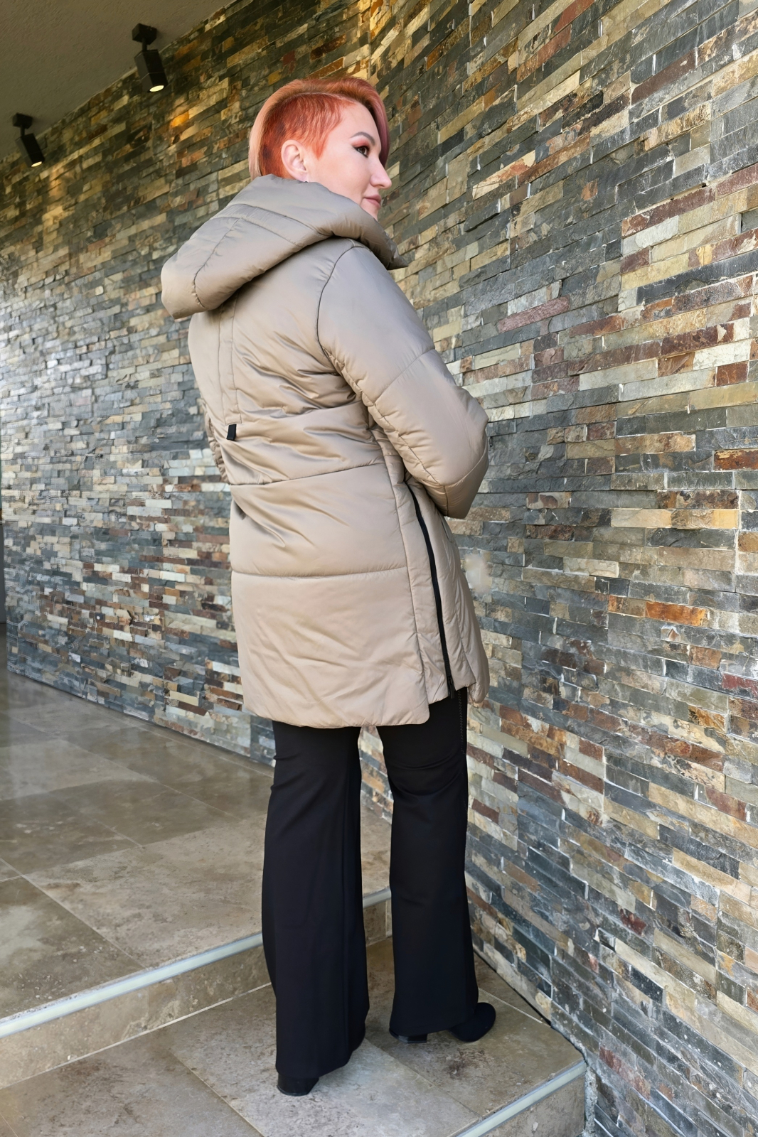 Geaca din material impermeabil de lungime medie, croi drept, cu gluga nedetasabila intr-o nuanta placuta de bej inchis cu accesorii negre.Produsul se incheie cu fermoar are 2 buzunare laterale care se inchid cu capse iar lateral, pt. comodiate, este prevazuta cu fermoare care la deschidere dau lejeritate in momentul in care sunteti gros imbracata pe dedesupt. Pentru o protectie superioara la frig manecile sunt prevazute cu mansete interioare stranse pe incheietura. Acest produs este recomandat pentru sezonul rece.