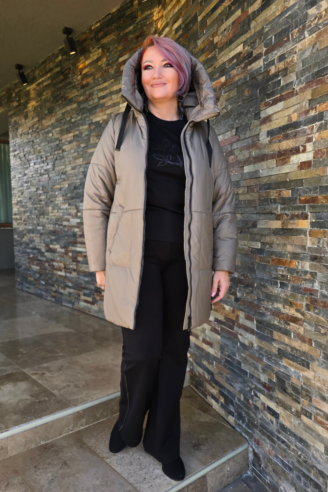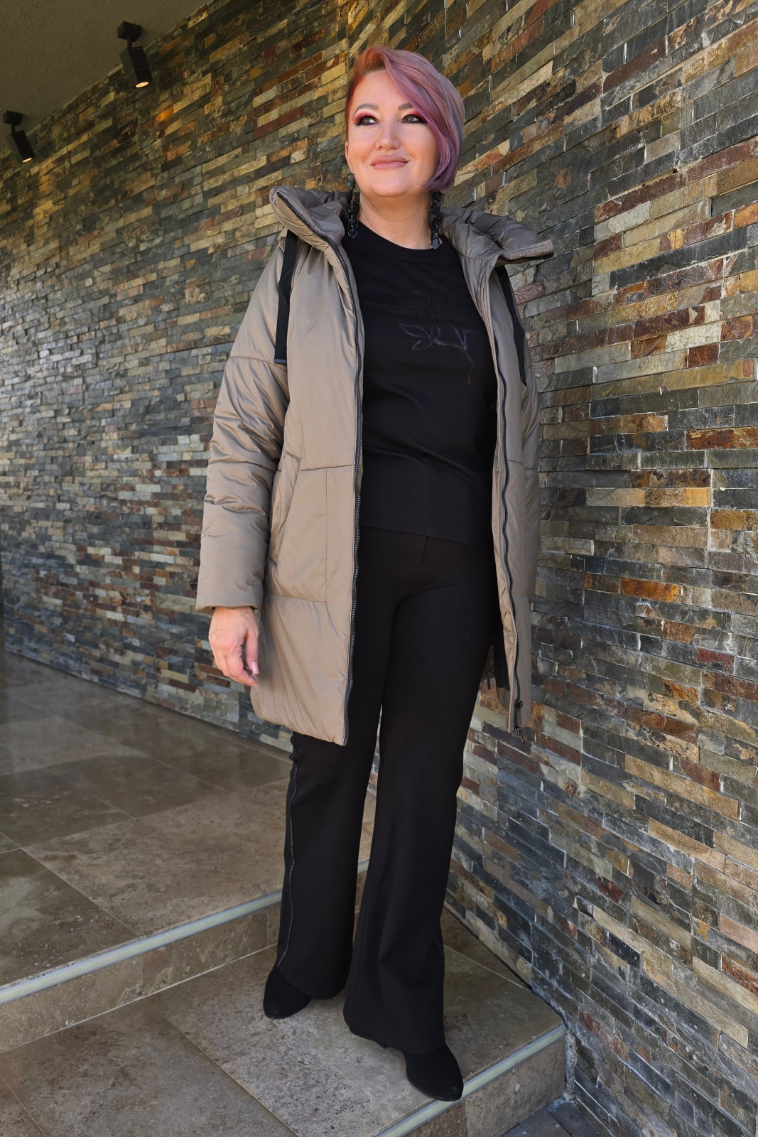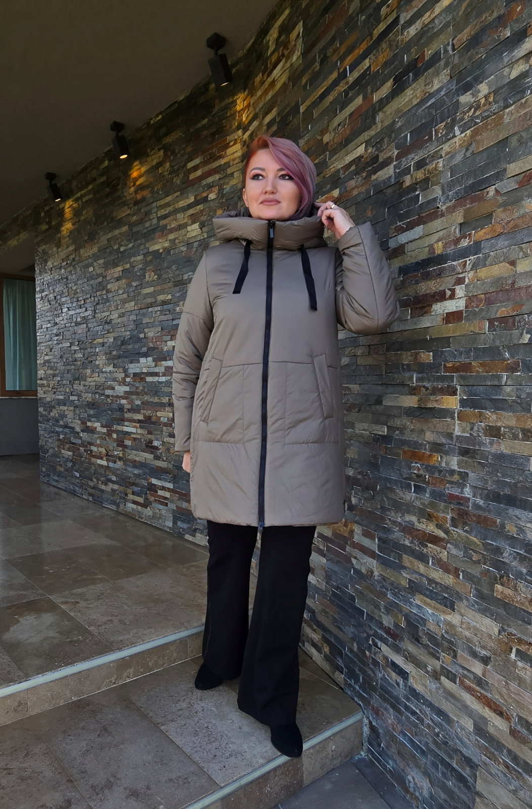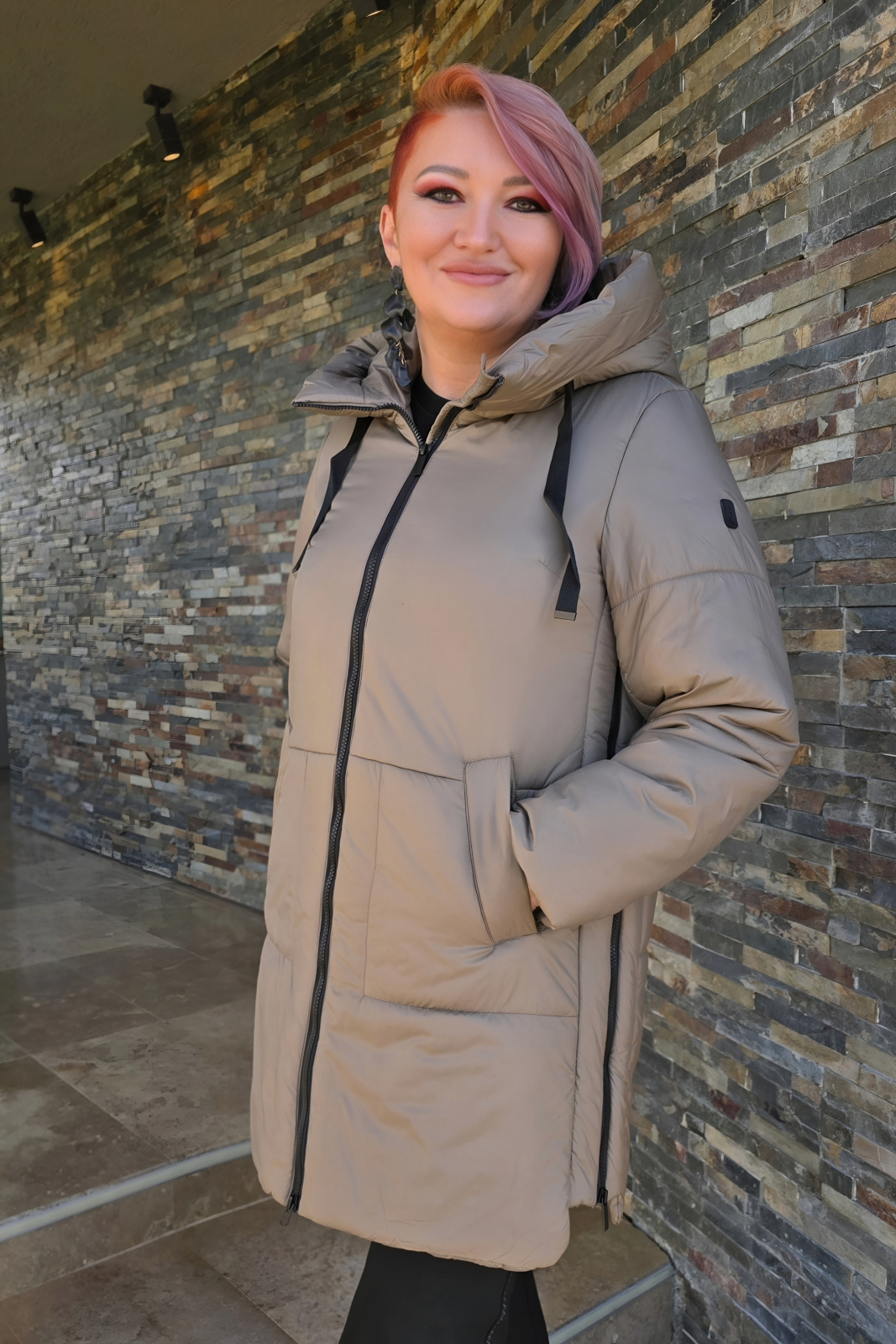 Geaca din material impermeabil de lungime medie, croi drept, cu gluga nedetasabila intr-o nuanta placuta de bej inchis cu accesorii negre.Produsul se incheie cu fermoar are 2 buzunare laterale care se inchid cu capse iar lateral, pt. comodiate, este prevazuta cu fermoare care la deschidere dau lejeritate in momentul in care sunteti gros imbracata pe dedesupt. Pentru o protectie superioara la frig manecile sunt prevazute cu mansete interioare stranse pe incheietura. Acest produs este recomandat pentru sezonul rece.