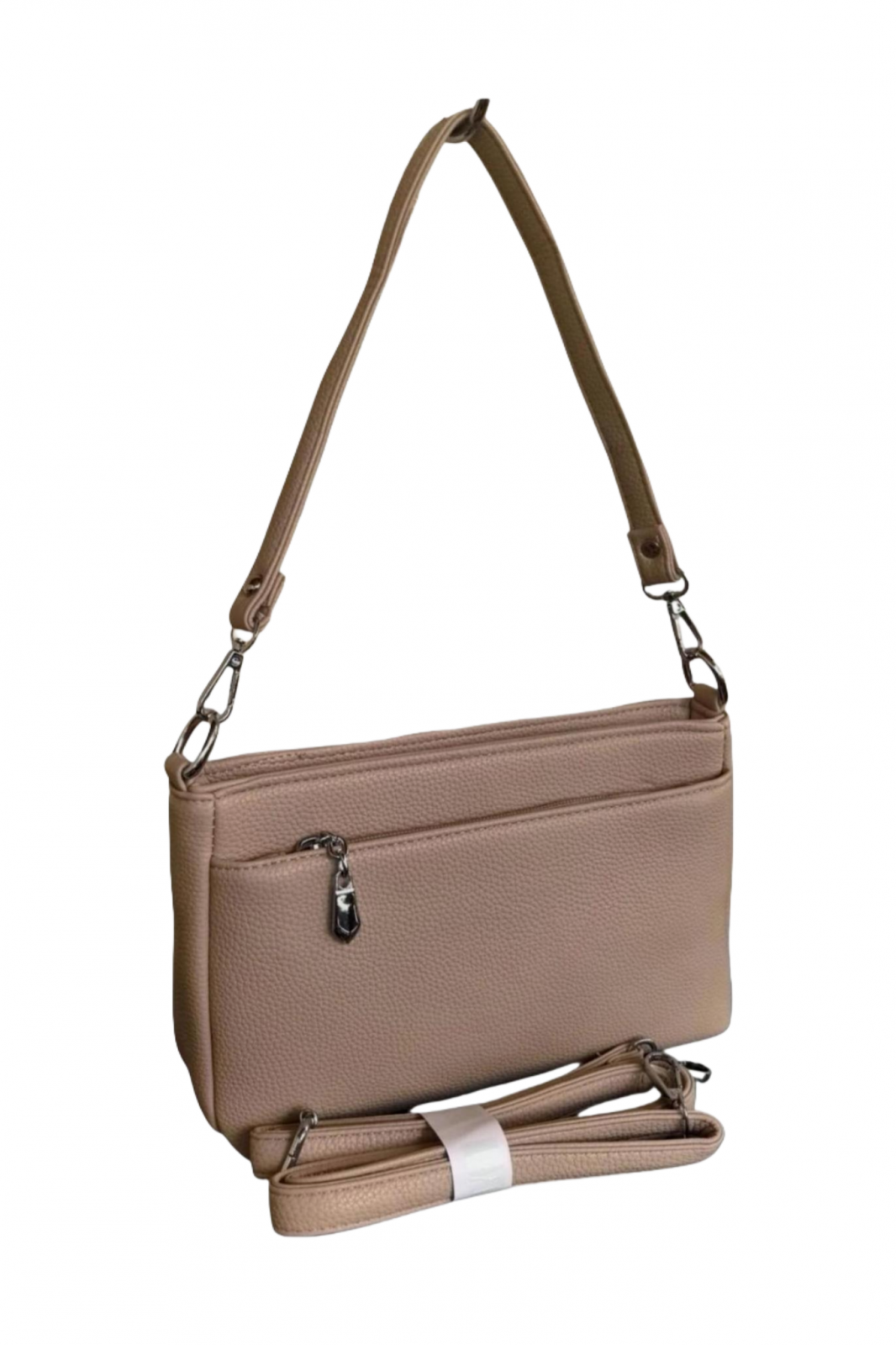Poseta din piele ecologica de mici dimensiuni. Inchidere cu fermoar, accesorii metalice argintii , 2 compartimente interioare, buzunare cu fermoar interior si exterior si doua 2 compartimente exterioare inchise cu fermoar. Include o curea din piele ecologica la culore pentru purtat pe umar sau antebrat.