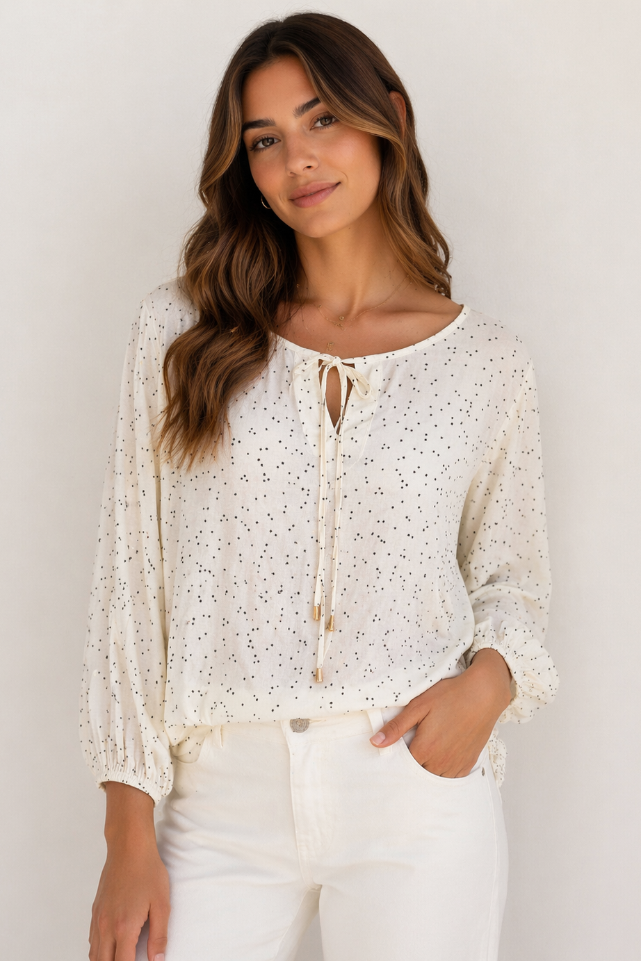 Bluza din vascoza cu șnur în decolteu si maneca 3/4 finalizata cu elastic la manseta. Materialul usor din vascoza, ofera confort pe tot parcursul zilei, iar croiala relaxata o face usor de integrat in orice tinuta.