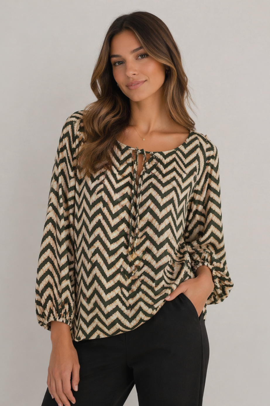 Bluza din vascoza cu șnur în decolteu si maneca 3/4 finalizata cu elastic la manseta. Materialul usor din vascoza, ofera confort pe tot parcursul zilei, iar croiala relaxata o face usor de integrat in orice tinuta.