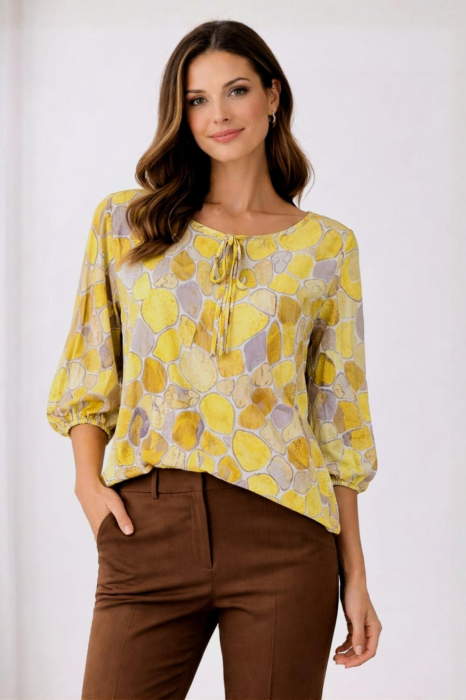 Bluza din vascoza cu șnur în decolteu si maneca 3/4 finalizata cu elastic la manseta. Materialul usor din vascoza, ofera confort pe tot parcursul zilei, iar croiala relaxata o face usor de integrat in orice tinuta.