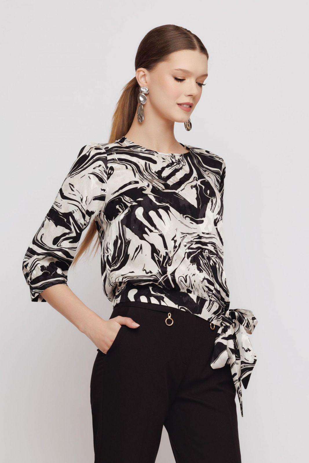 Bluza scurta din tesatura imprimata, ce se leaga la terminatie in partea laterala.