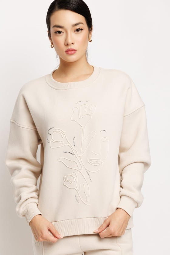 Bluza lejera din tesatura tricotata uni, cu strasuri si siret decorativ aplicat in fata.
