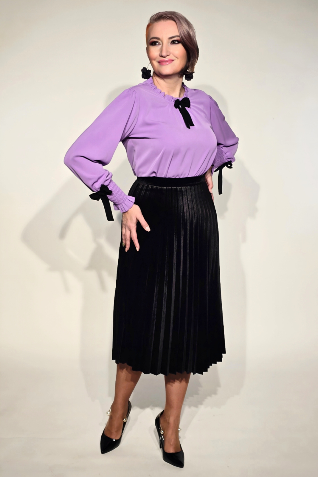 O bluză delicată, în nuanța suavă a liliacului, care îmbină feminitatea cu un aer jucăuș și elegant. Realizată dintr-un material fluid și opac, aceasta cade frumos pe siluetă, oferind confort și rafinament în același timp.