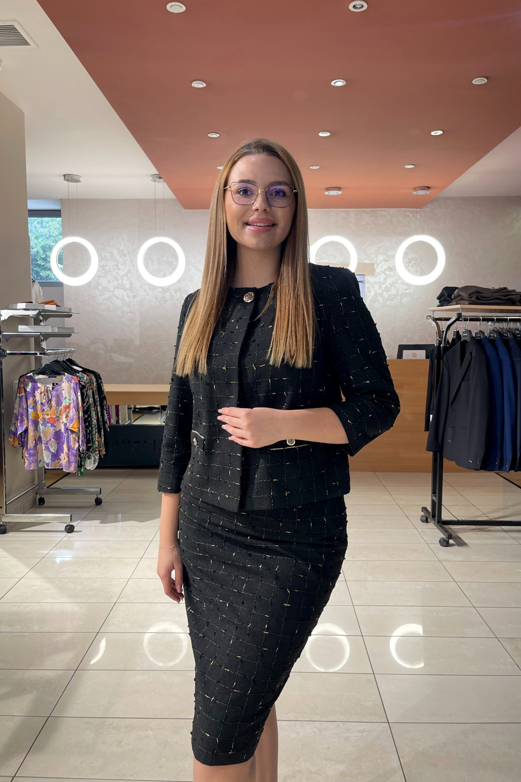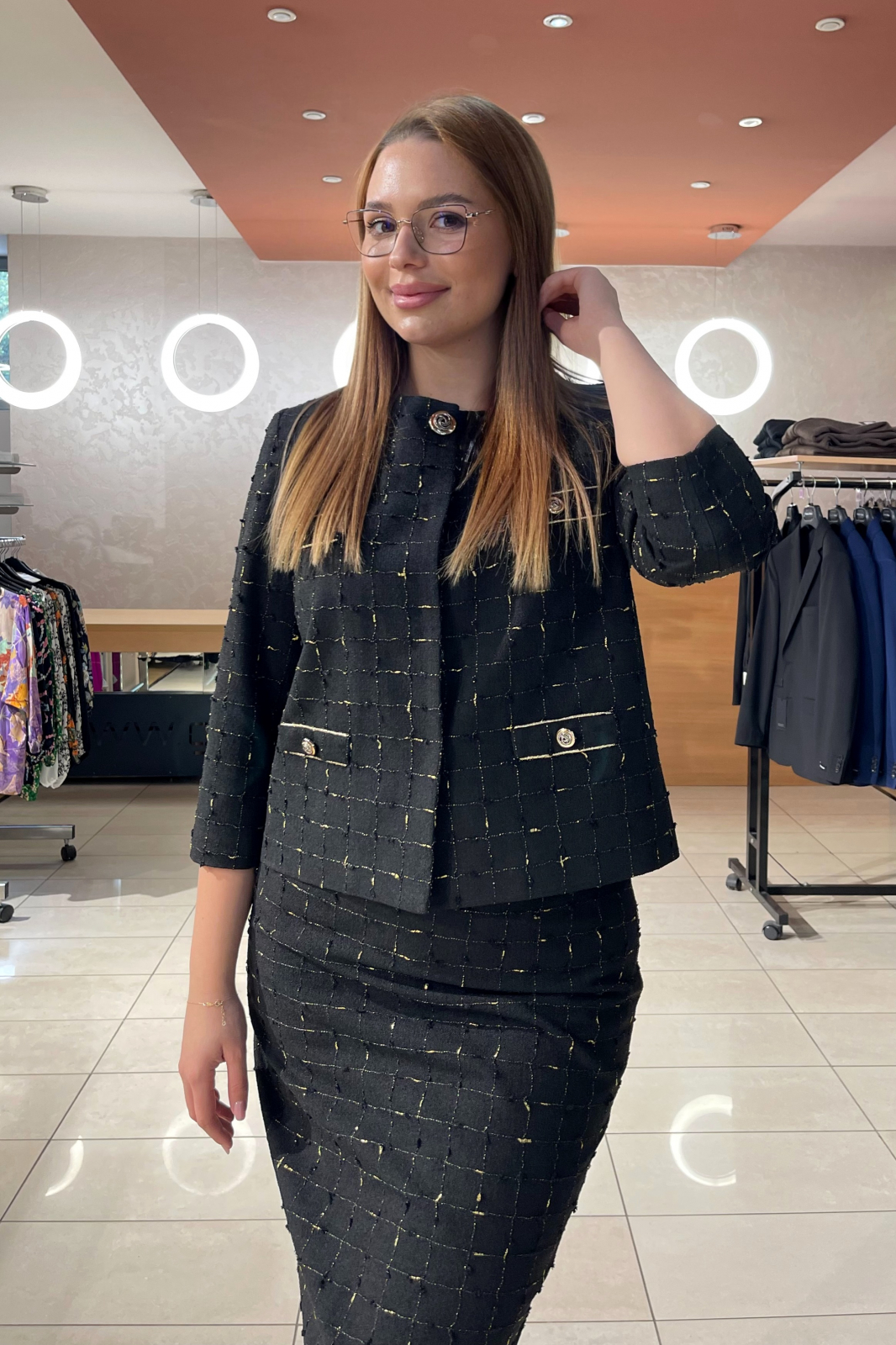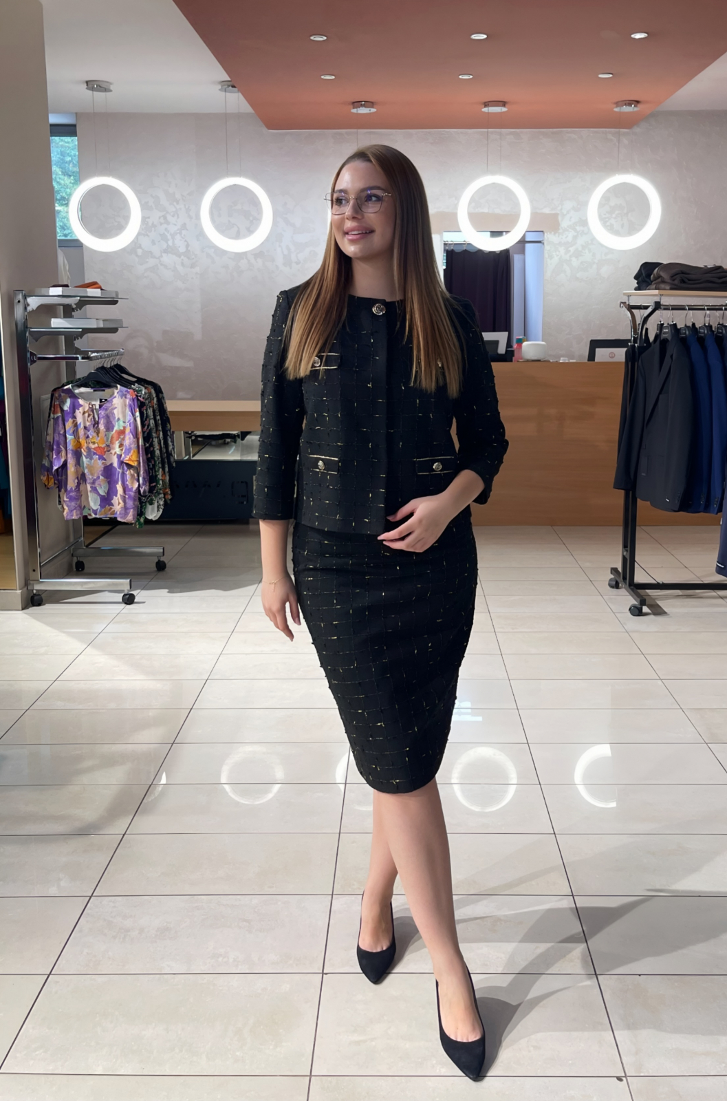 Un compleu elegant și sofisticat, format dintr-un sacou inspirat de stilul clasic Chanel și o fustă conică, realizat din cea mai delicată combinație de nuanțe negru auriu.