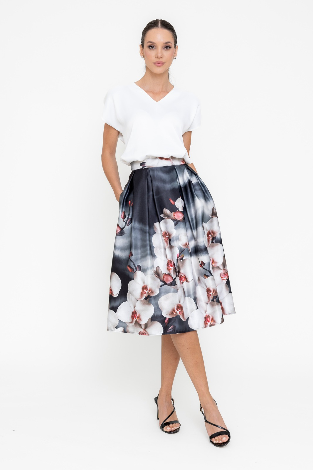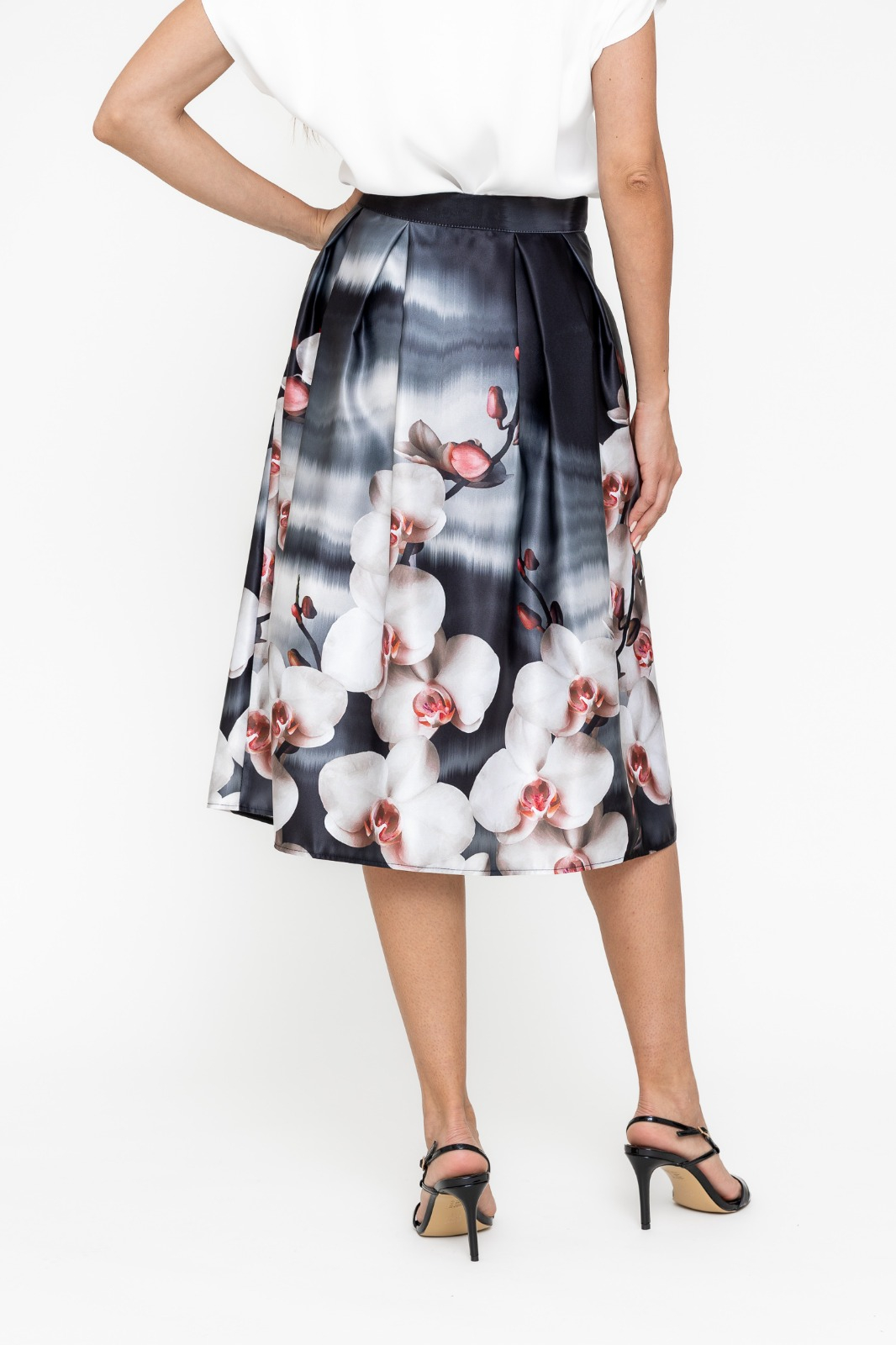 Fustă midi cu pliuri, elegantă și feminină, perfectă pentru un look sofisticat. Talia înaltă accentuează silueta și oferă un plus de rafinament. Închidere laterală cu fermoar pentru un finisaj discret. Buzunare laterale funcționale, practice și stilate. Confectionată din satin, cu imprimeu floral delicat. Ideală pentru ținute elegante, ușor de asortat cu bluze simple sau topuri rafinate. Fusta nu dispune de captuseala.