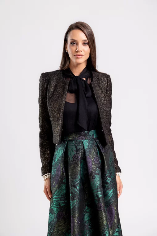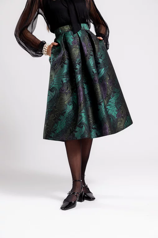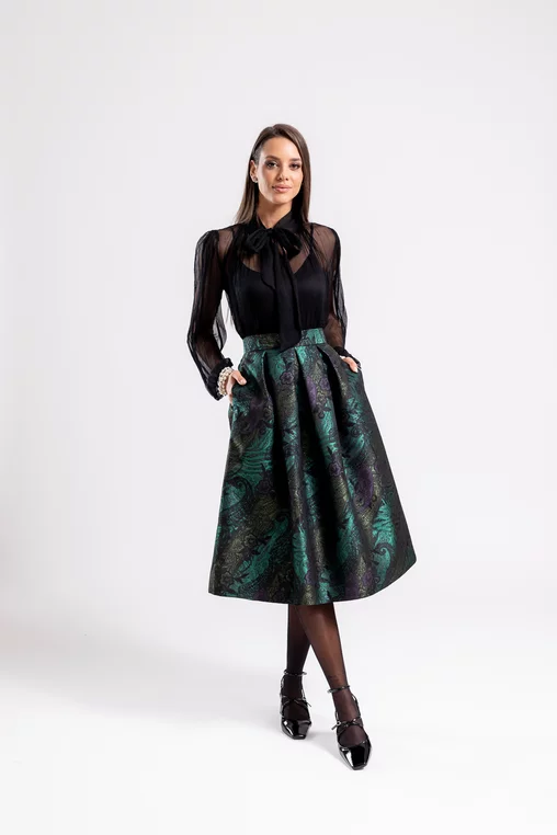 Fusta Carame Collection midi elegantă, confecționată din brocard de înaltă calitate, este o piesă sofisticată și rafinată, perfectă pentru ocazii speciale. Cu pliuri adânci, adaugă volum și mișcare, oferindu-i un aspect bogat și plin de eleganță. Betelia lată subliniază talia, creând o siluetă feminină, iar închiderea cu fermoar la spate asigură un finisaj discret și elegant. Buzunarele laterale funcționale aduc un plus de utilitate, fără a compromite designul stilat al fustei. Această piesă versatilă este ideală pentru evenimente sau ocazii în care vrei să impresionezi prin eleganță și bun gust.