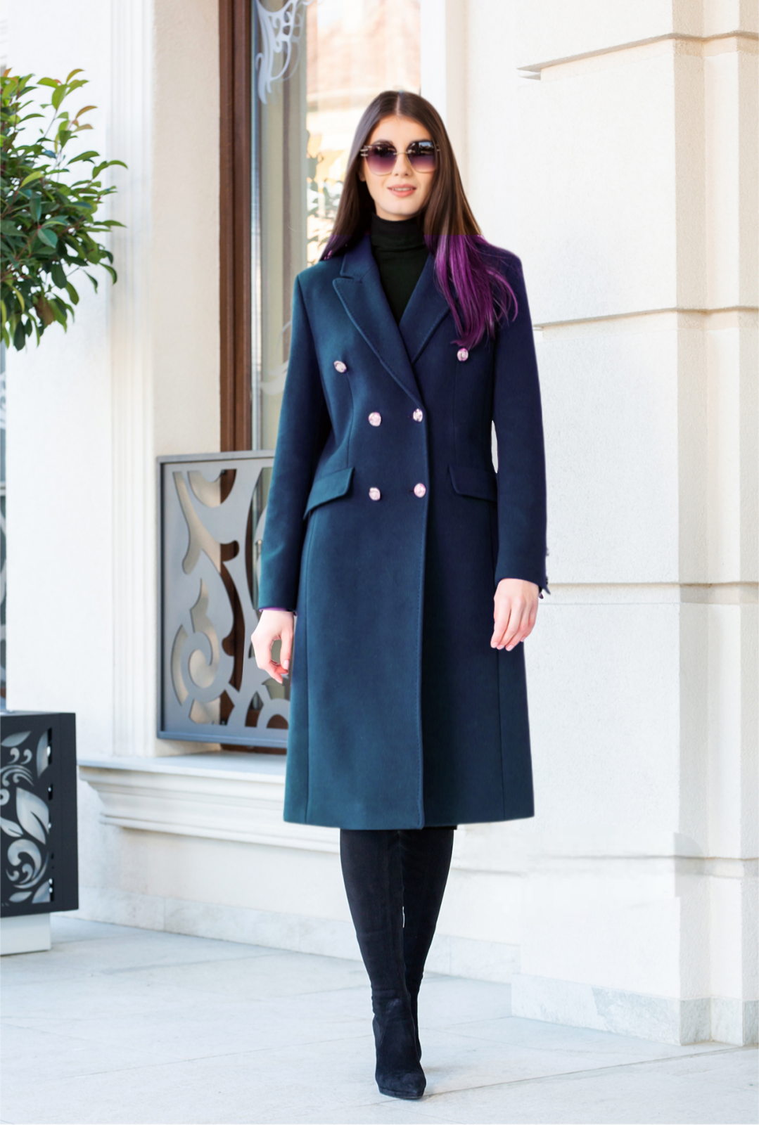 Palton cambrat, elegant ,cu 2 randuri de nasturi decorativi (aurii) cu buzunare cu clapete si slit la spate.