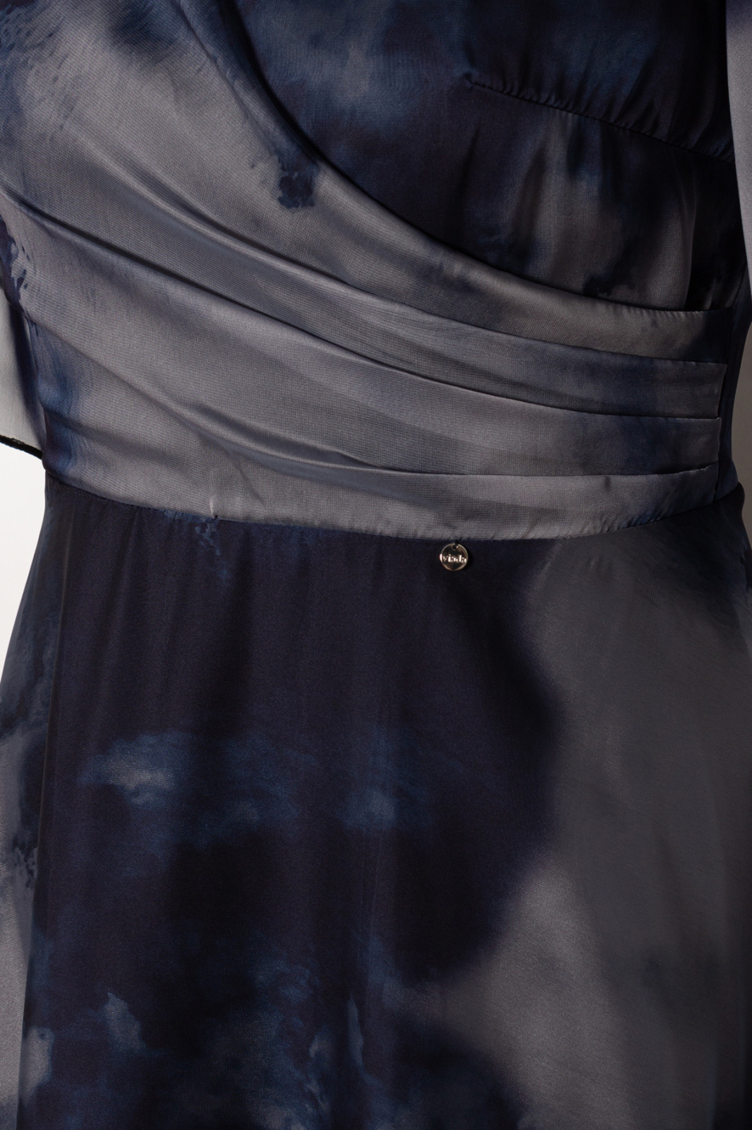 Rochie elegantă midi din voal cu imprimeu abstract bleumarin, captuseala in ton, decolteu rotund cu decupaj discret, talie marcată, mâneci scurte tip fluture, fermoar ascuns pe spate.