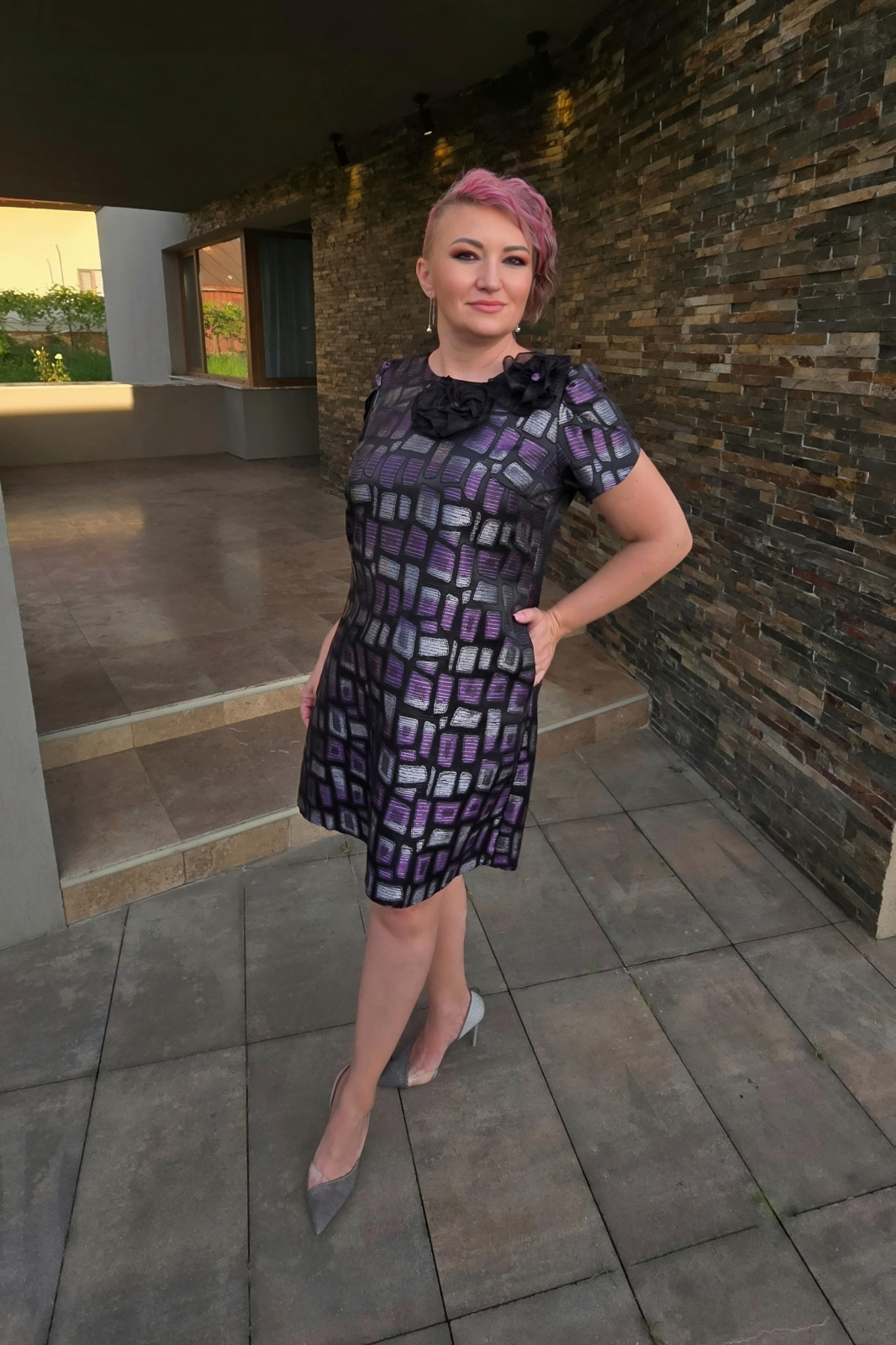 Rochie eleganta cu imprimeuri. Are decolteu rotund accesorizat cu flori cusute, maneci scurte si croiul evazat. De asemenea are buzunare functionale si inchidere cu fermoar ascuns la spate. Nu dispune de captuseala.