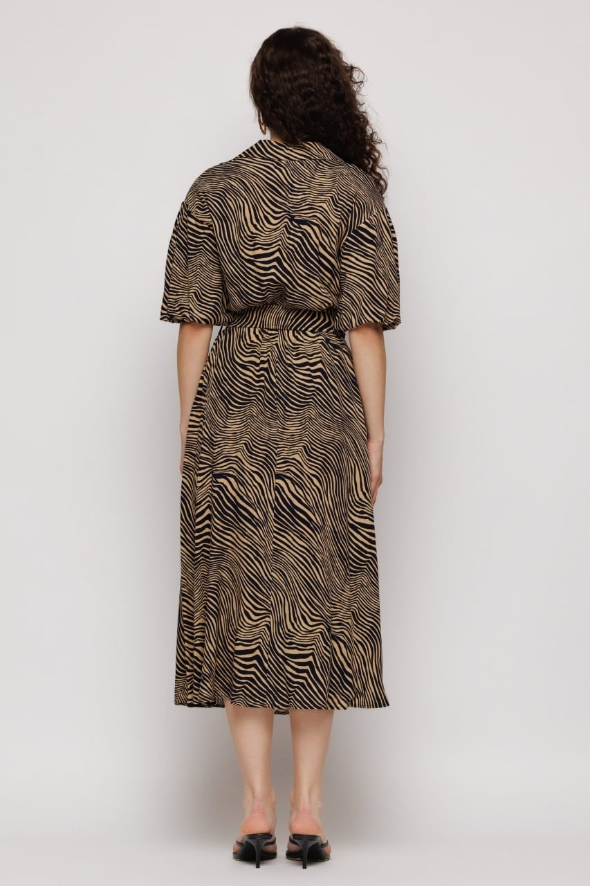 Rochie din vâscoză imprimată, într-o combinație elegantă de bej și bleumarin, perfectă pentru un look feminin și relaxat. Croiul lejer este completat de mâneci scurte tip gogoașă, care adaugă volum și un plus de rafinament. Gulerul tip cămașă și închiderea cu nasturi oferă un aer clasic, ușor de integrat atât în ținute casual, cât și în apariții mai elegante.