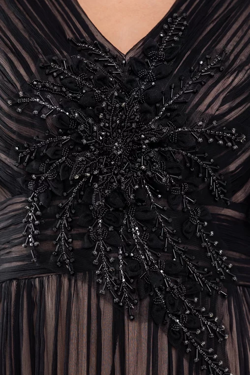 Rochie midi elegantă, realizată din mătase naturală fluidă și fină, cu un design ce îmbină rafinamentul și feminitatea. Are decolteu în V ce alungește silueta, mâneci scurte și o talie marcată de o bandă lată încrețită, care accentuează subtil linia corpului. Se închide la spate cu fermoar ascuns pentru un aspect impecabil, iar aplicația florală lucrată manual adaugă o notă sofisticată și unică fiecărei piese.