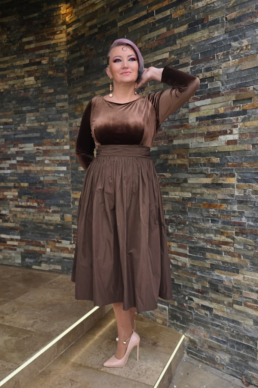 Fii o apariție spectaculoasă cu  rochia Caramel Collection elegantă midi, o piesă deosebită ce combină eleganța clasică cu detalii moderne. Realizată dintr-o catifea moale și luxoasă, rochia impresionează prin fusta amplă din tafta, care oferă volum și mișcare grațioasă la fiecare pas. Designul său sofisticat este accentuat de un decolteu tip bărcuță și mâneci lungi, ce adaugă o notă de feminitate și rafinament. Talia este pusă în valoare de o bandă încrețită, care definește silueta și subliniază delicatețea formelor.