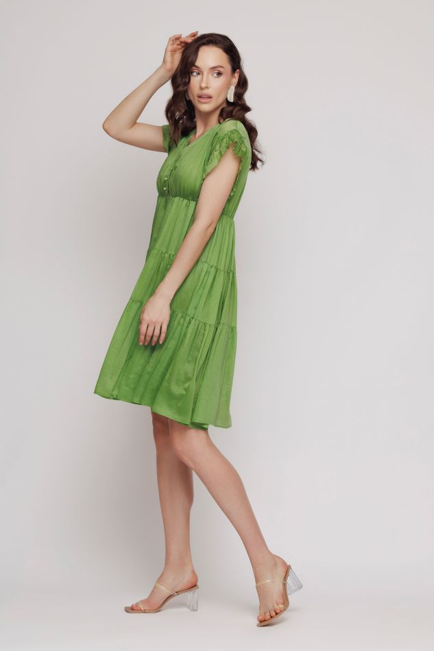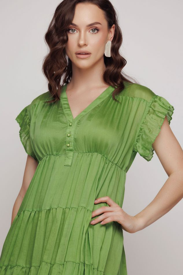 Rochie incretita din tesatura uni, cu volane incretite. Se incheie in fata cu nasturi