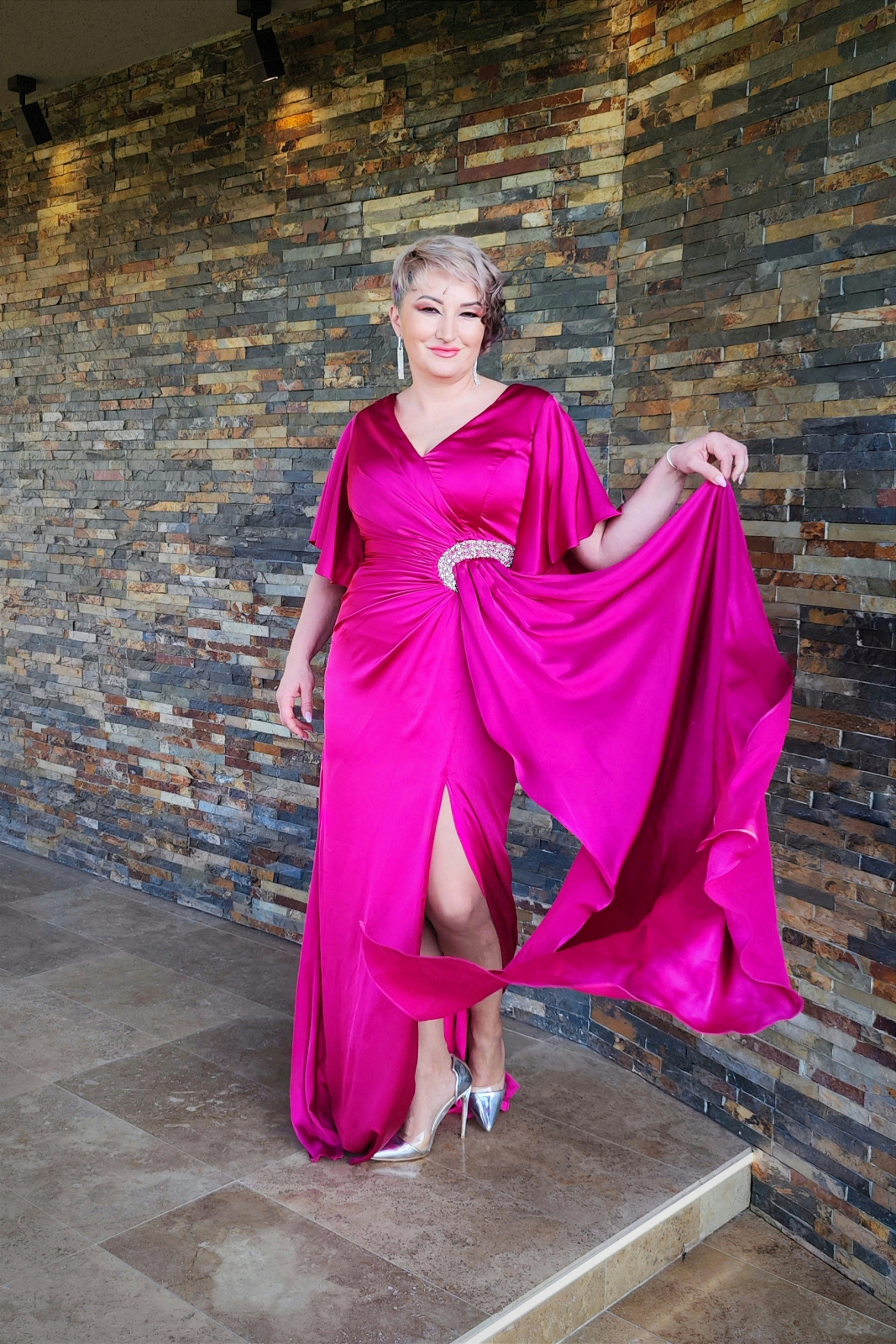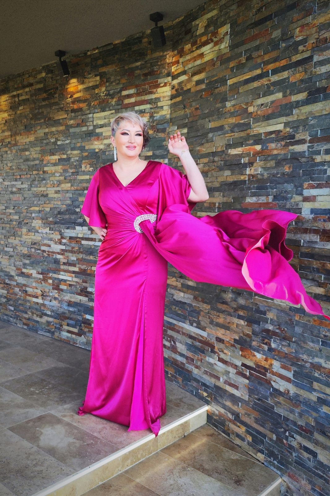 Rochie lunga din saten cu mânecă clopot și fronseuri in zona taliei. Decolteu in V atât în fața cât și în spate, are cupe in zona bustului, un accesoriu cu pietre argintiu pe partea stângă și o crăpătură pe picior. Închiderea se face cu fermoar ascuns pe mijlocul spatelui.