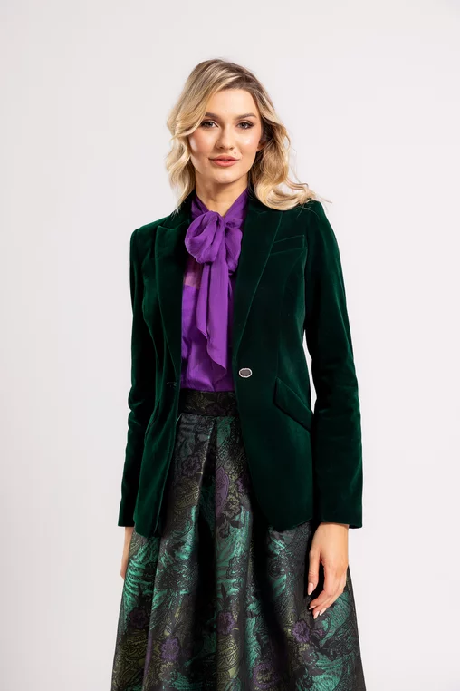Sacoul Caramel Collection elegant din catifea este definit de o croială cambrată, ce evidențiază frumos silueta. Reverele ascuțite și crestate adaugă un aer sofisticat, perfect pentru ocazii speciale sau evenimente formale.Închis la un nasture îmbrăcat, decorat cu un trandafir metalic auriu, oferind un detaliu rafinat și deosebit. Buzunarul decorativ la piept și clapele decorative completează designul elegant, conferindu-i un aspect modern și feminin. Ideal pentru un look sofisticat, acest sacou din catifea este piesa perfectă pentru a-ți completa garderoba cu stil.