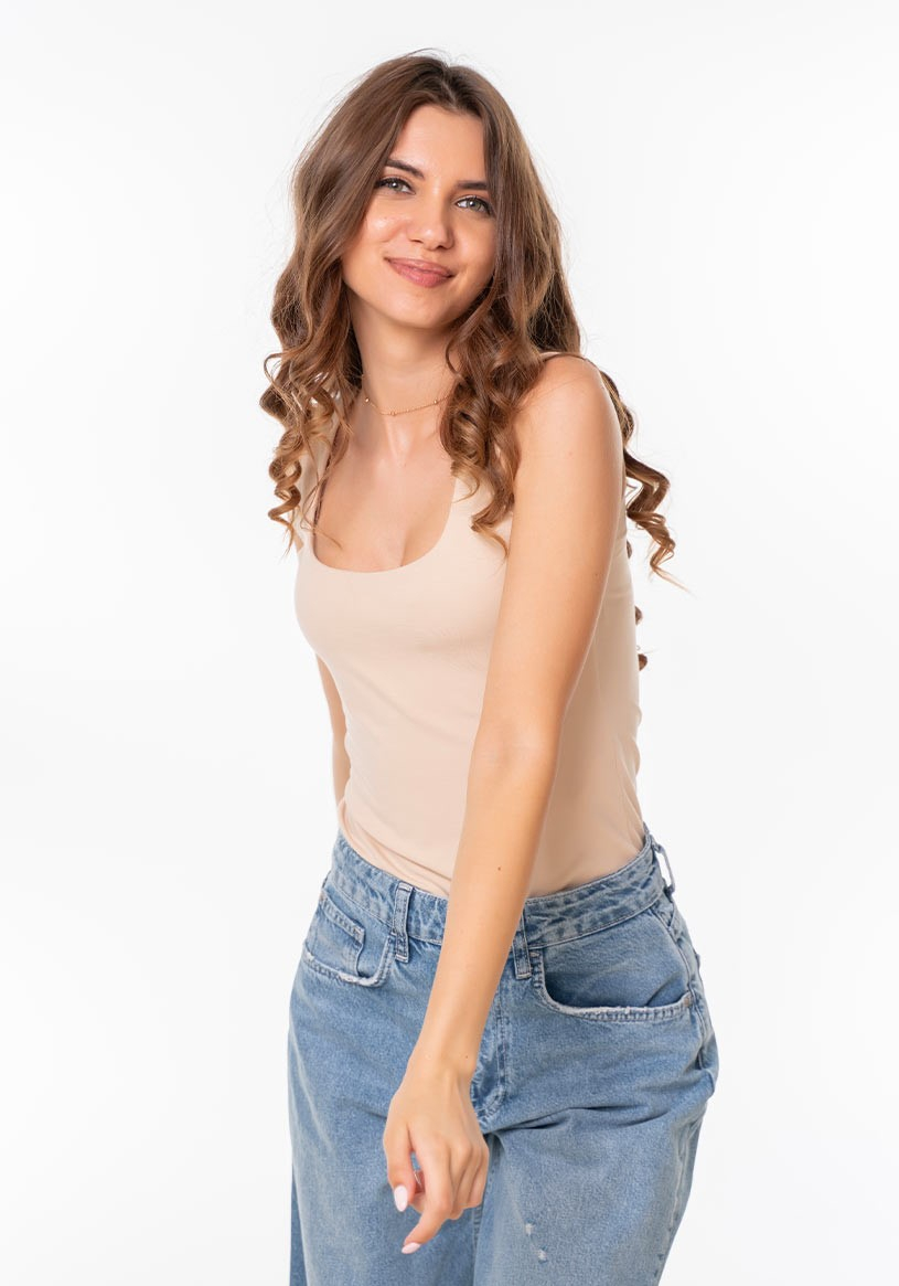 Simplu, versatil si modern: top uni basic din material bielastic. Decolteul rotund clasic si bretele late iti contureaza frumos silueta. Confectionat dintr-un material bielastic iti va oferi confort si libertate de miscare in orice moment al zilei. Fie ca il asortezi cu o fusta eleganta sau cu perechea de blugi preferati, va fi acea piesa cheie a garderobei tale.