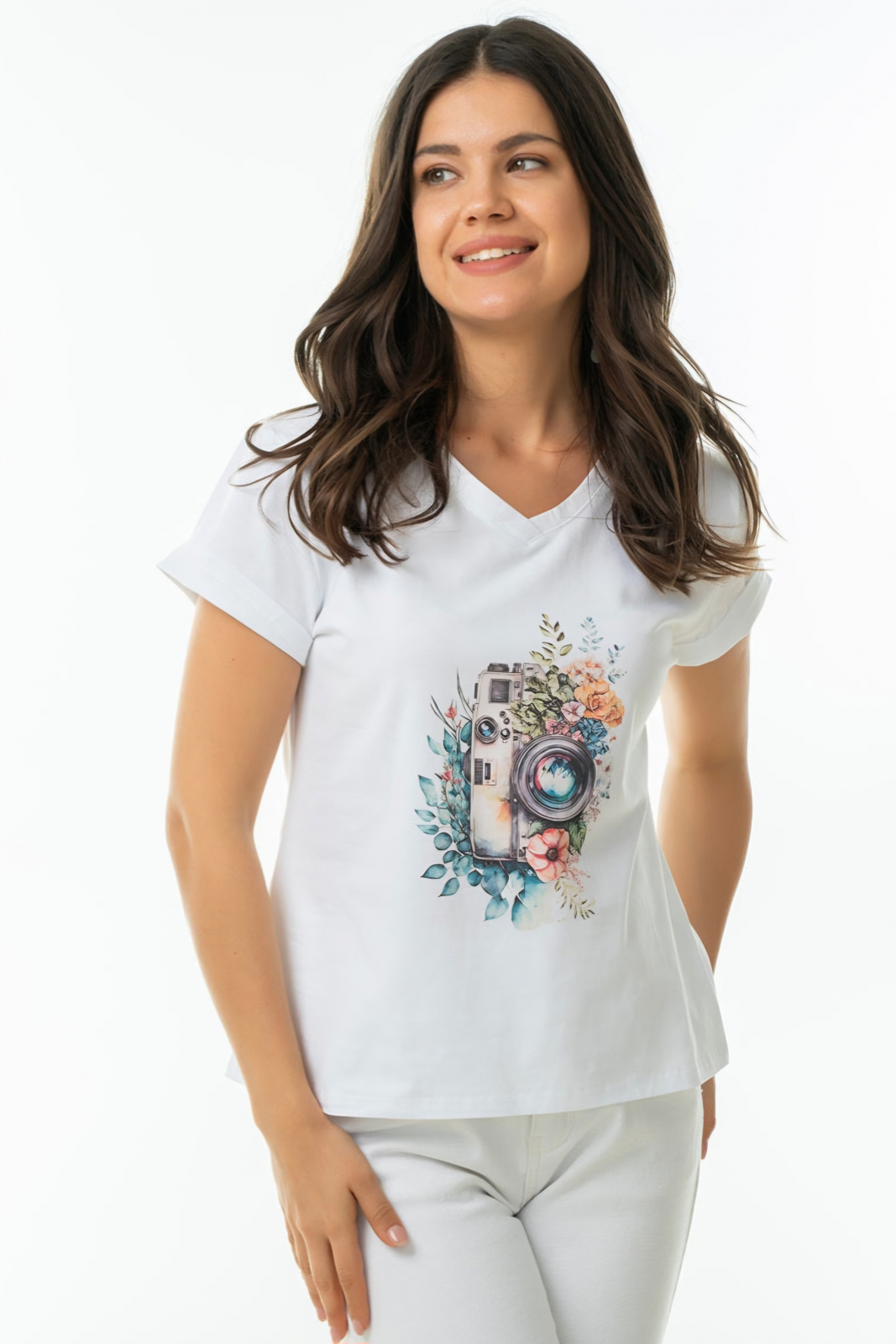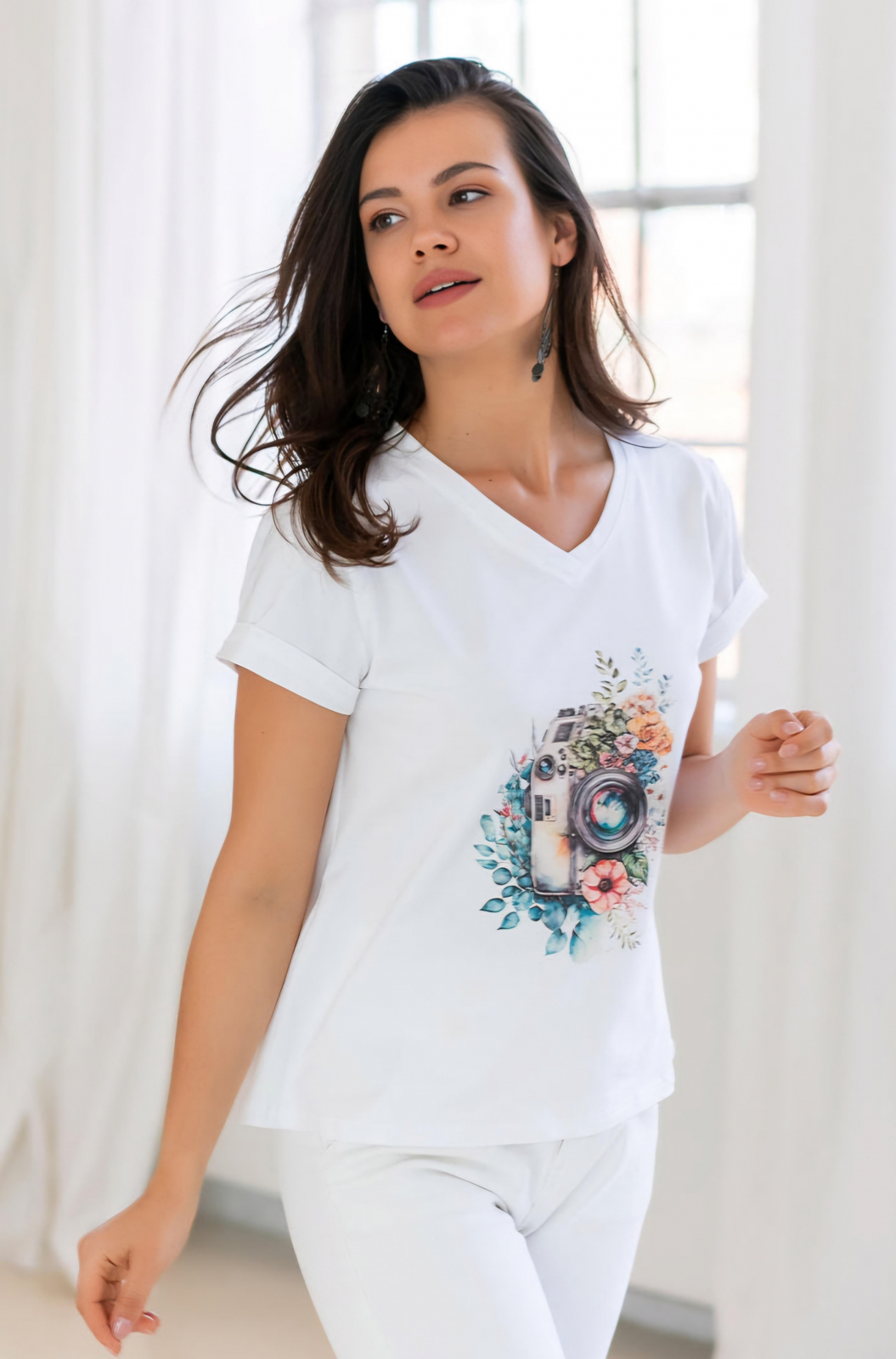 Esenta creativitatii si nostalgia vintage: tricou din bumbac si elastan cu decolteu in V. Cu un imprimeu artistic pe partea frontala, in culori pastel delicate, imbina nota retro si confortul contemporan. Poarta-l cu nonsalanta in combinatie cu jenasii preferati sau o fusta ampla.