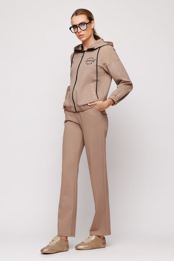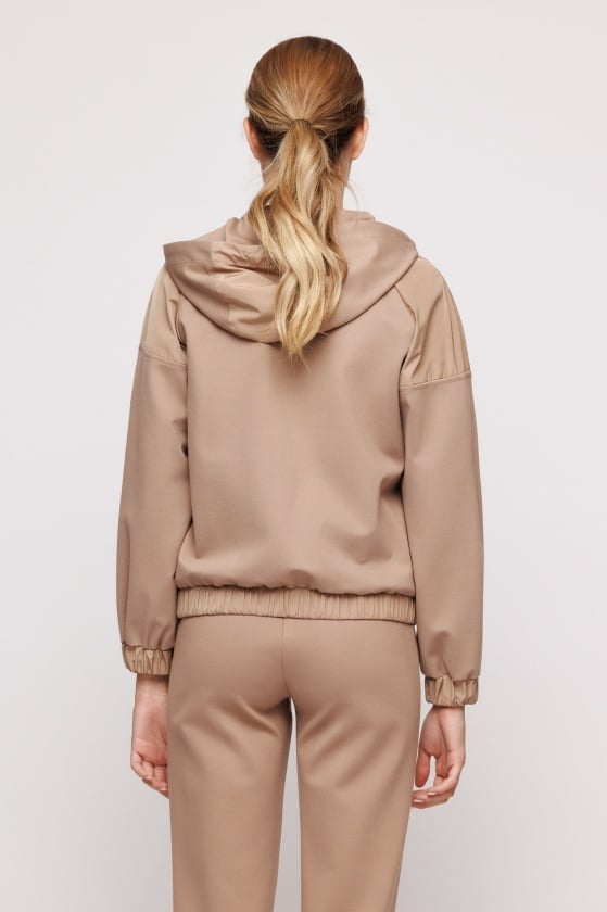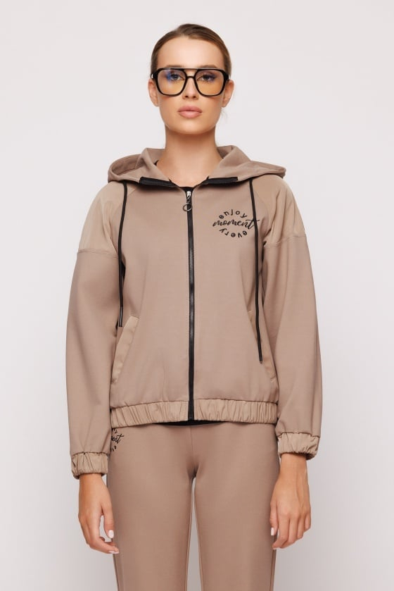 Hanorac lejer din tesatura tricotata uni combinata cu fas, cu gluga reglabila cu siret in contrast, buzunare si broderie pe piept. Se incheie in fata cu fermoar. Broderia este realizata in atelierul Mizar.