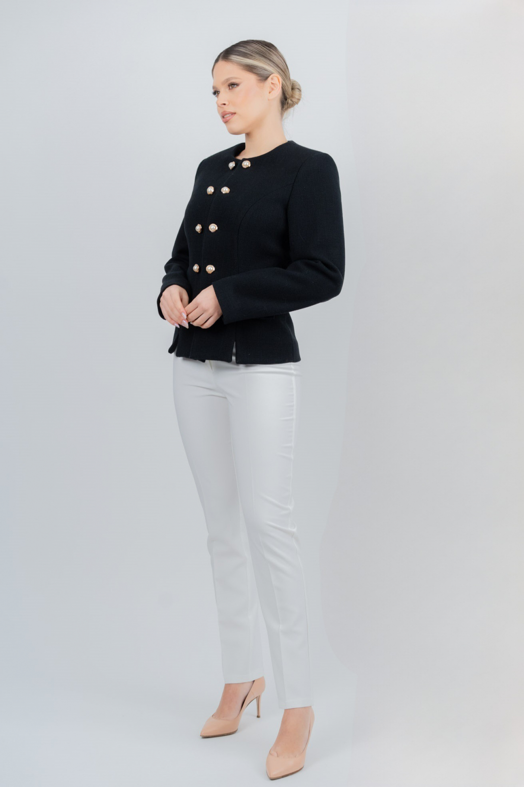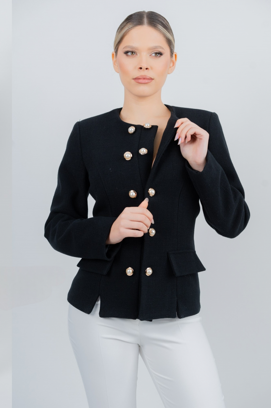 Jacheta neagra,din stofa tesuta cu doua randuri de nasturi perla.