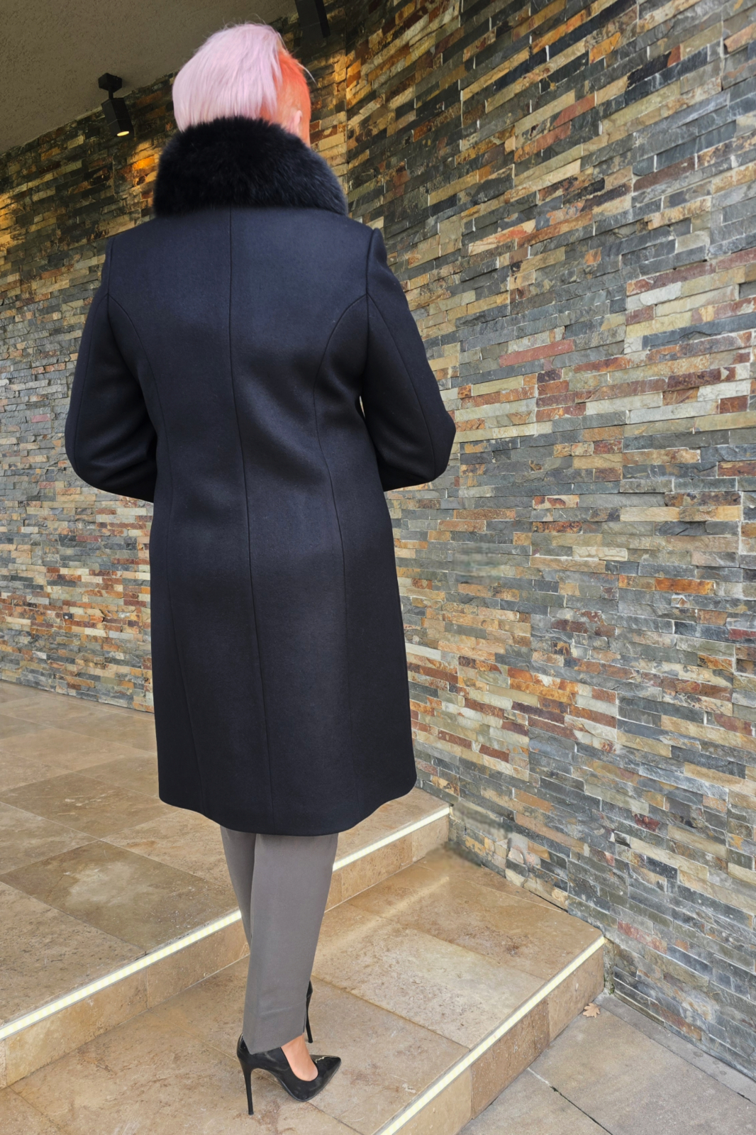 Palton elegant din stofa calitativa 80% lână, cu guler din blana naturala asortata detasabila (coada vulpe), dedesupt guler rusesc. Inchidere tip capsa cu doi nasturi decorativi metalici în partea de sus, si cu nasturi ascunsi de fenta in partea de jos. Produsul este vatuit si este prevazut cu buzunare laterale functionale.