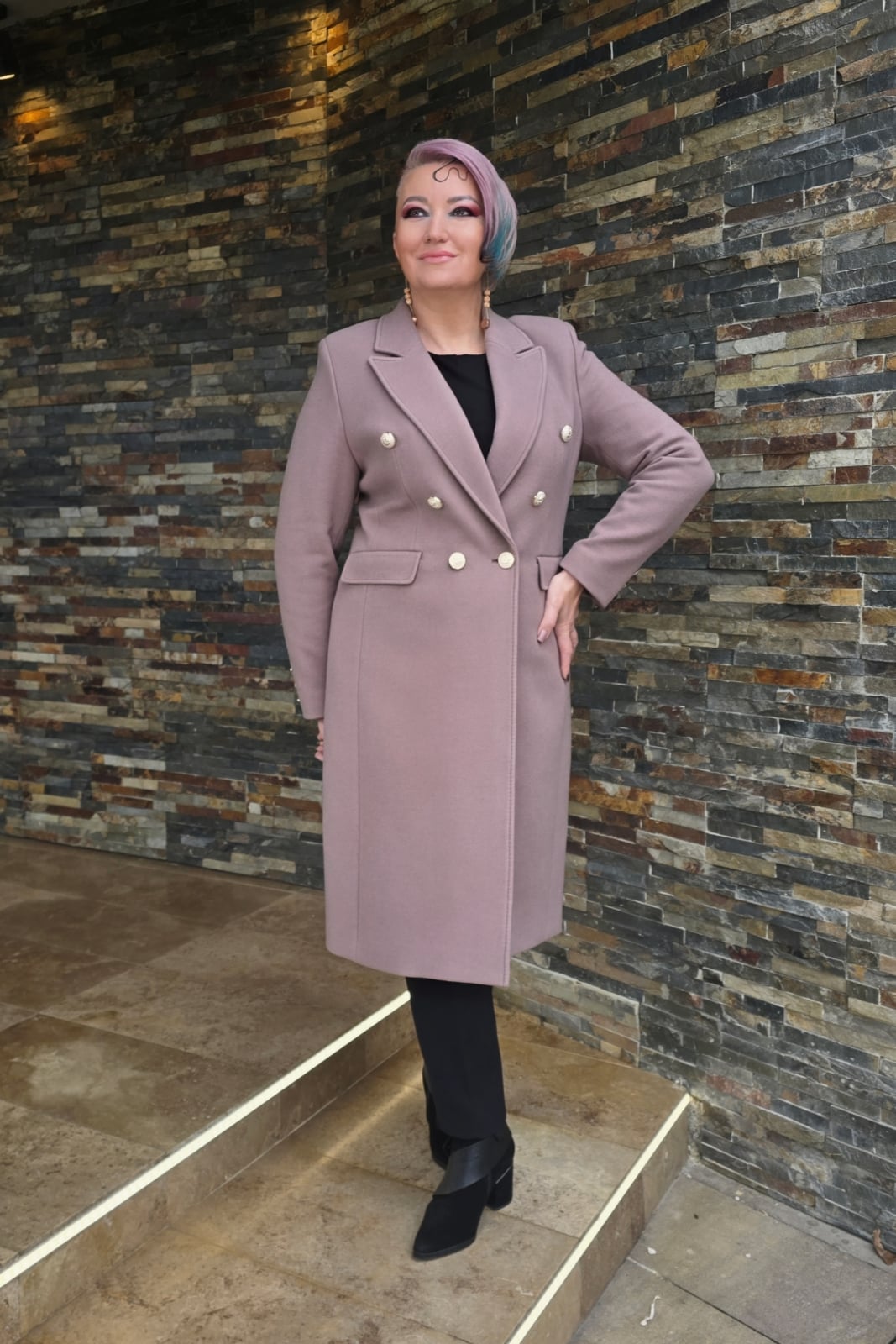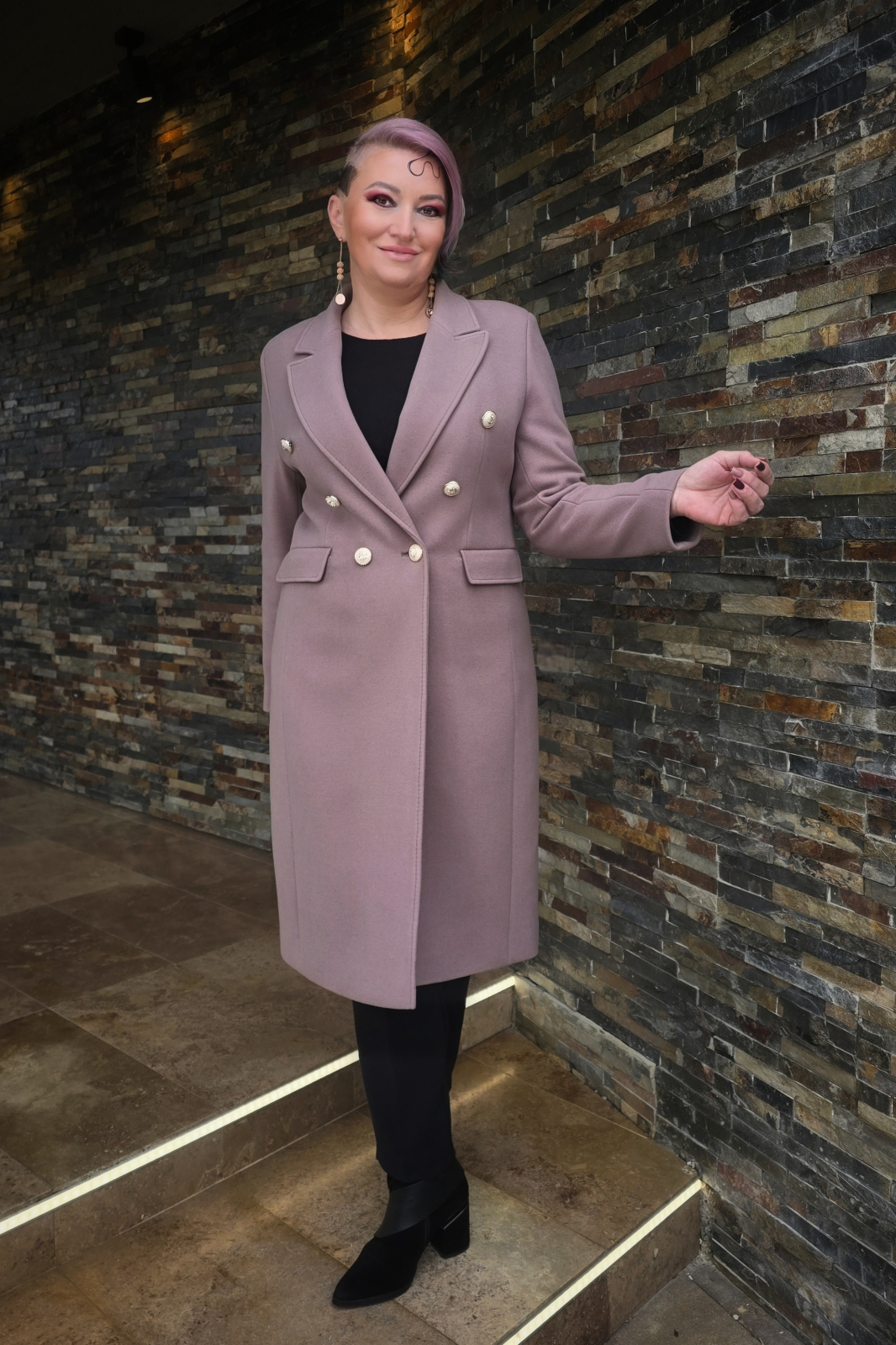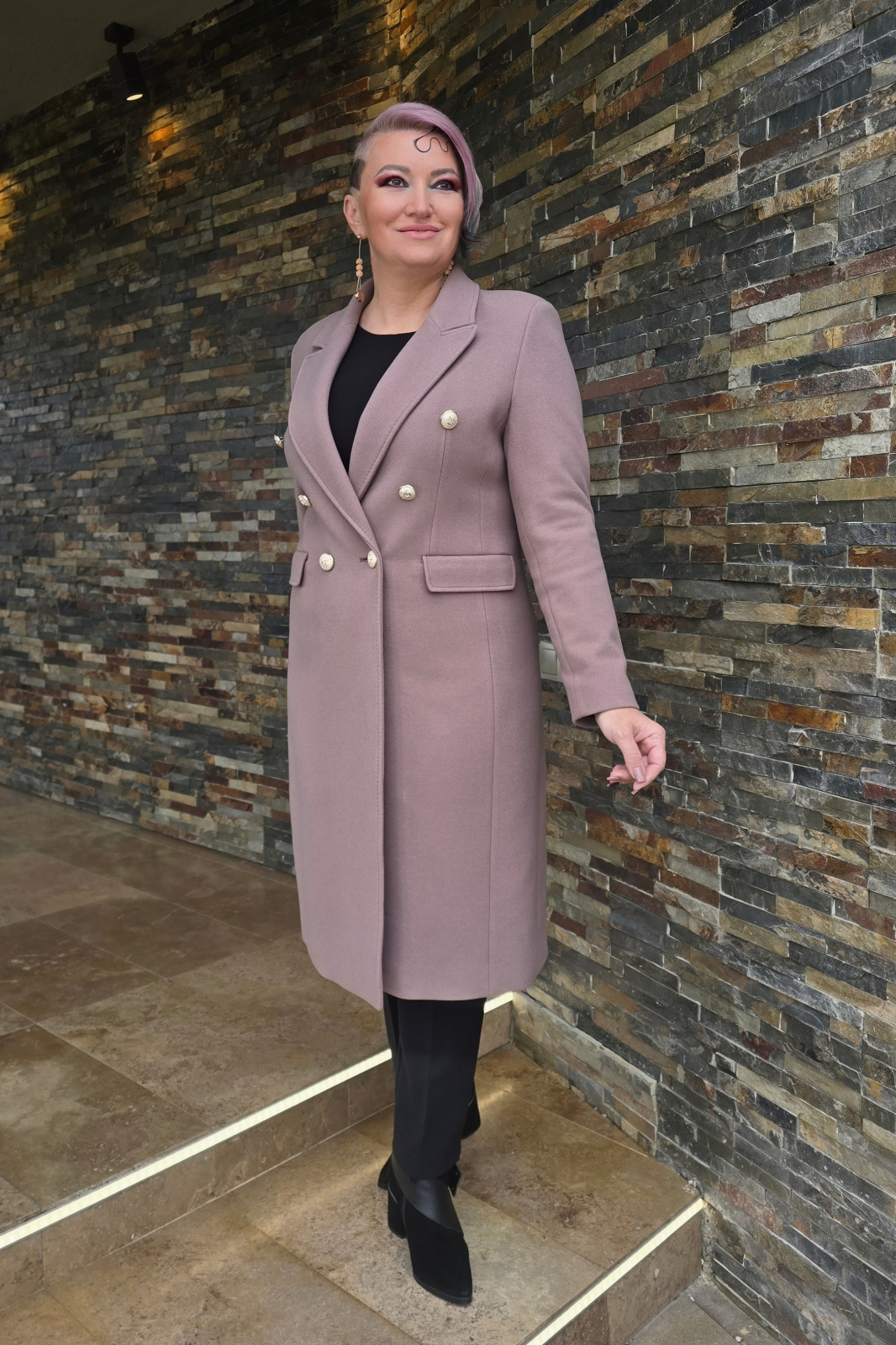 Palton cambrat, elegant ,cu 2 randuri de nasturi decorativi (aurii) cu buzunare cu clapete si slit la spate.