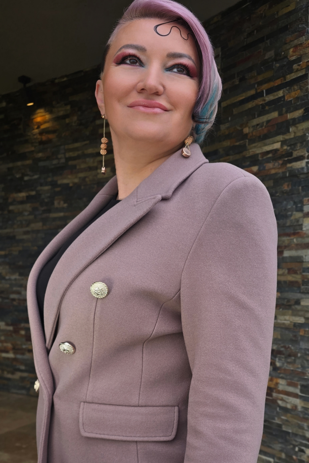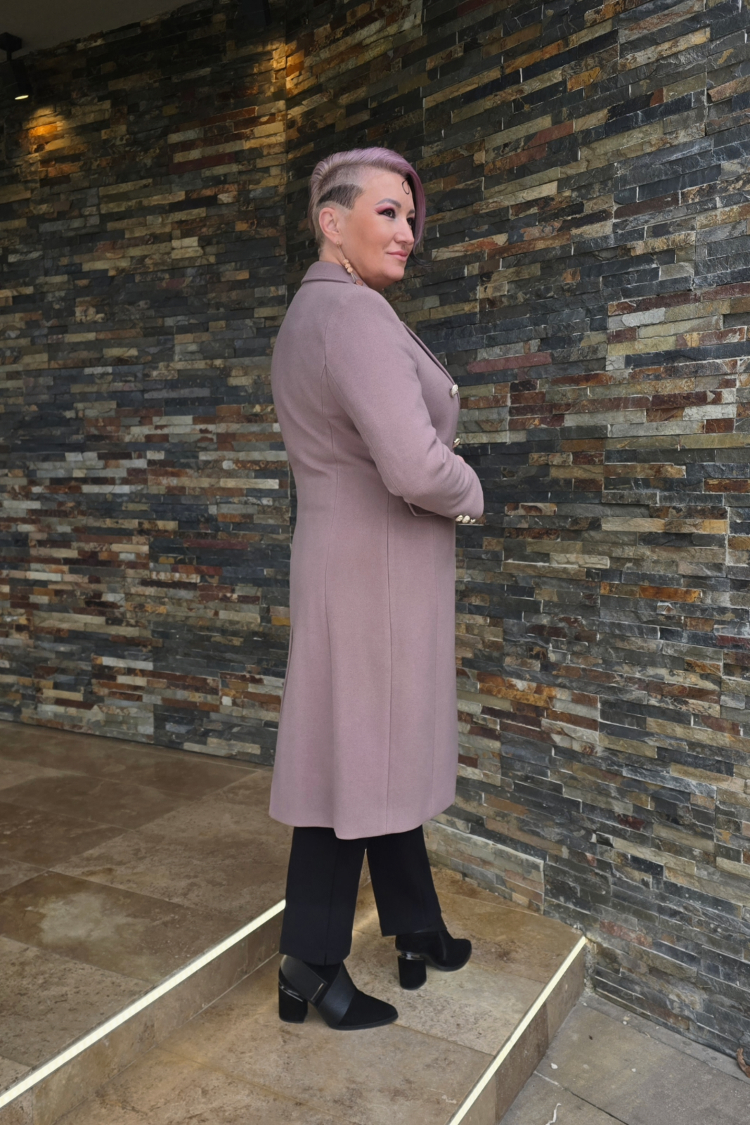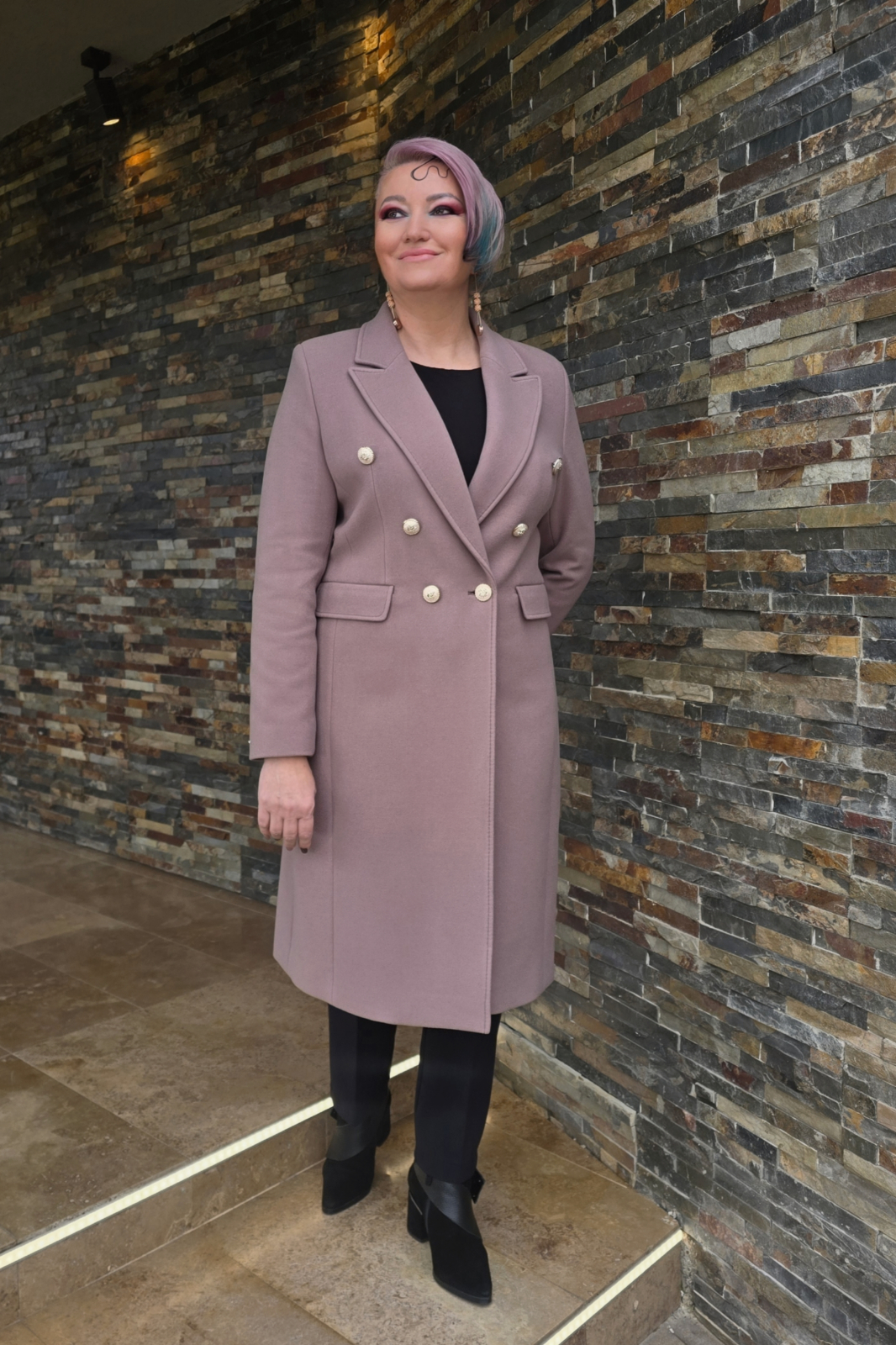 Palton cambrat, elegant ,cu 2 randuri de nasturi decorativi (aurii) cu buzunare cu clapete si slit la spate.