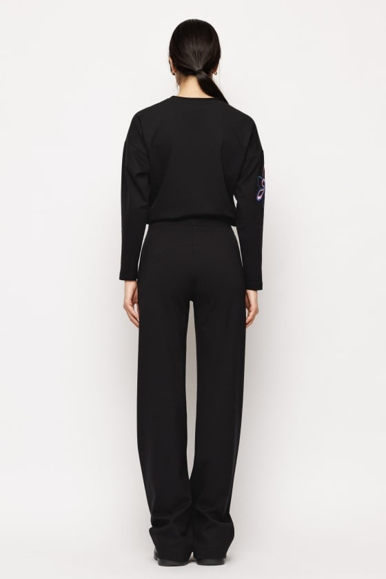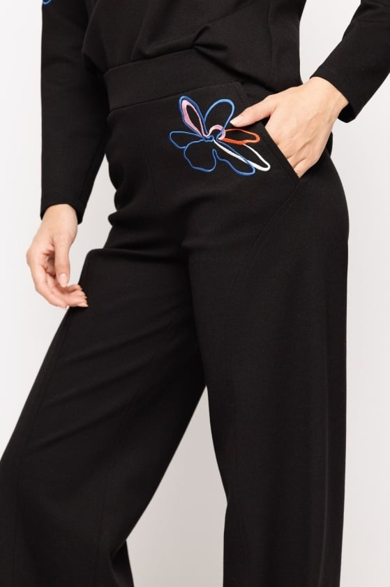 Pantaloni drepti, largi, din tesatura tricotata uni, cu buzunare si broderie in fata. Broderia este realizata in atelierul Mizar.