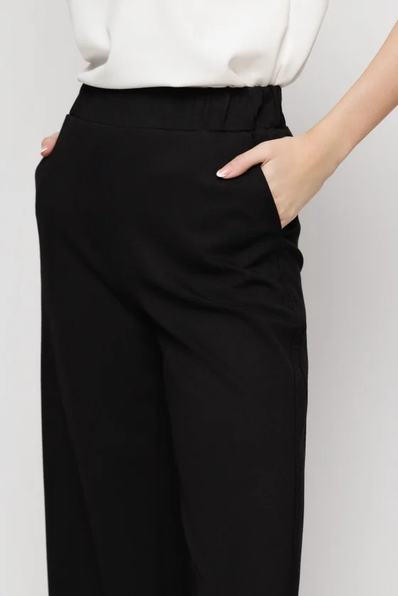 Pantaloni largi din tesatura tricotata uni, cu buzunare si talia reglabila cu elastic.