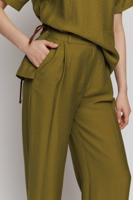 Pantalon vaporos cu pliuri si buzunare functionale din vascoza cu in intr-o nuanta superba de verde kaki. Inchiderea se face cu fermoar si nasture, betelia este prevazuta cu gaici pentru curea si elastic in partea din spate pentru comoditate. Impreuna cu "Bluza 6158 kaki Mizar" formeaza un outfit elegat atat prin culoare cat si prin simplitate.