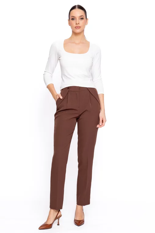 Pantalon conic din stofă subțire de primăvară, creat pentru confort și eleganță în fiecare zi la birou. Talia înaltă avantajează silueta, iar pliul decorativ adaugă un plus de rafinament și structură. Modelul se închide cu fermoar și copcii ascunse, oferind un finisaj curat și un aspect îngrijit. Buzunarele laterale sunt funcționale și evidențiate prin bandă decorativă și nasture, un detaliu modern care completează designul. Dunga călcată pe toată lungimea piciorului alungește optic silueta și transformă acest pantalon într-o piesă esențială pentru ținutele office. Ușor de asortat cu sacouri, cămăși sau topuri elegante, este alegerea ideală pentru un look profesionist, feminin și actual.