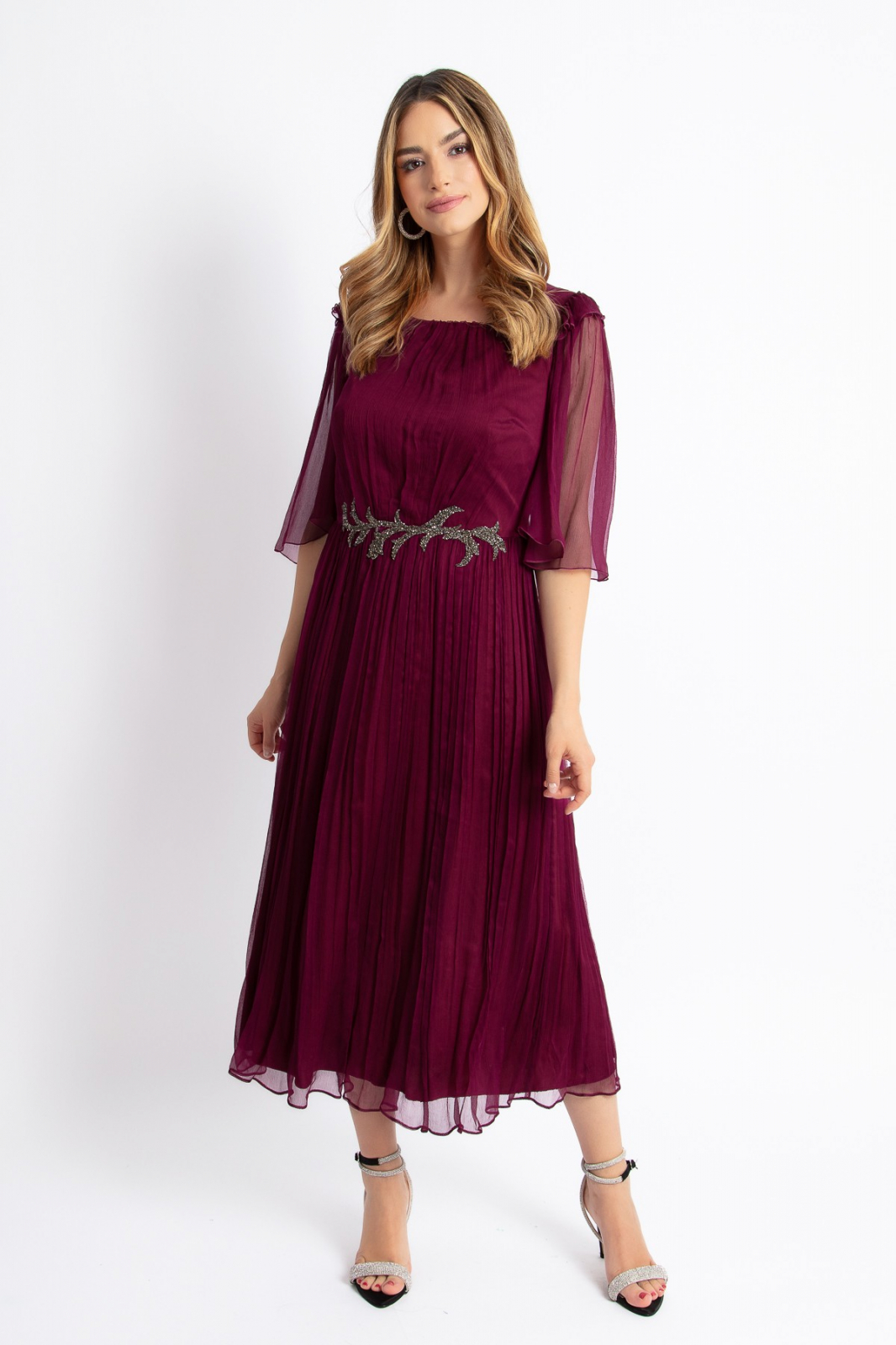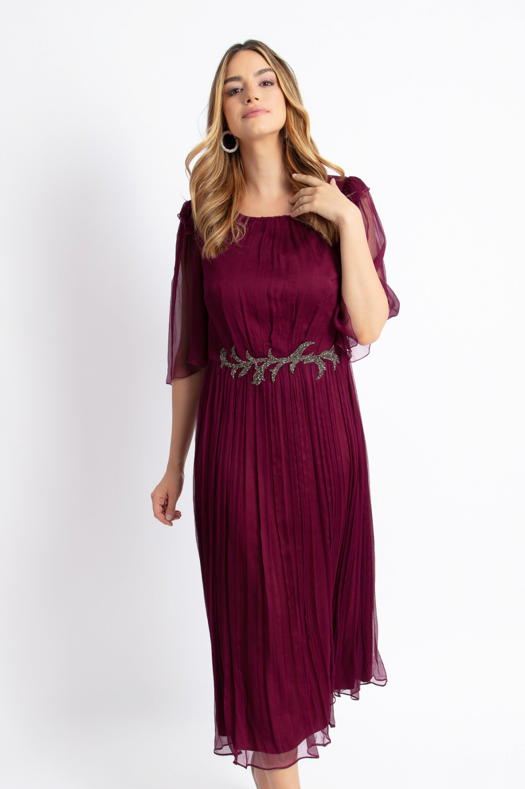 Rochie eleganta din matase bordo, de lungime medie, cu decolteu rotund, maneca scurta despicata, ampla, cu volanase pe umeri, accesoritata in talie cu aplicatie cu pietricele, incheiata cu fermoar ascuns pe spate.