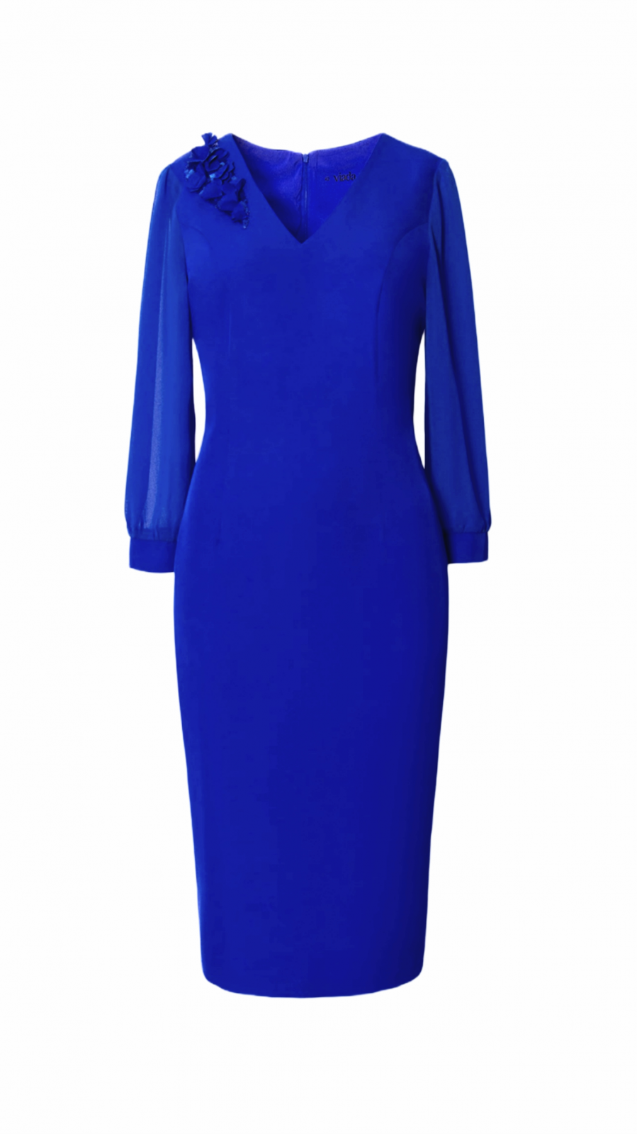 Rochie eleganta din tesatura royal, de lungime medie, decolteu in V, decorat cu flori 3D aplicate manual, maneca trei sferturi din voal, slit, inchidere cu fermoar ascuns pe spate.