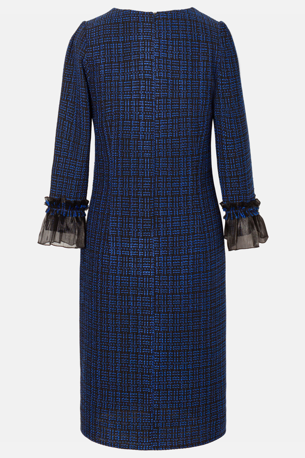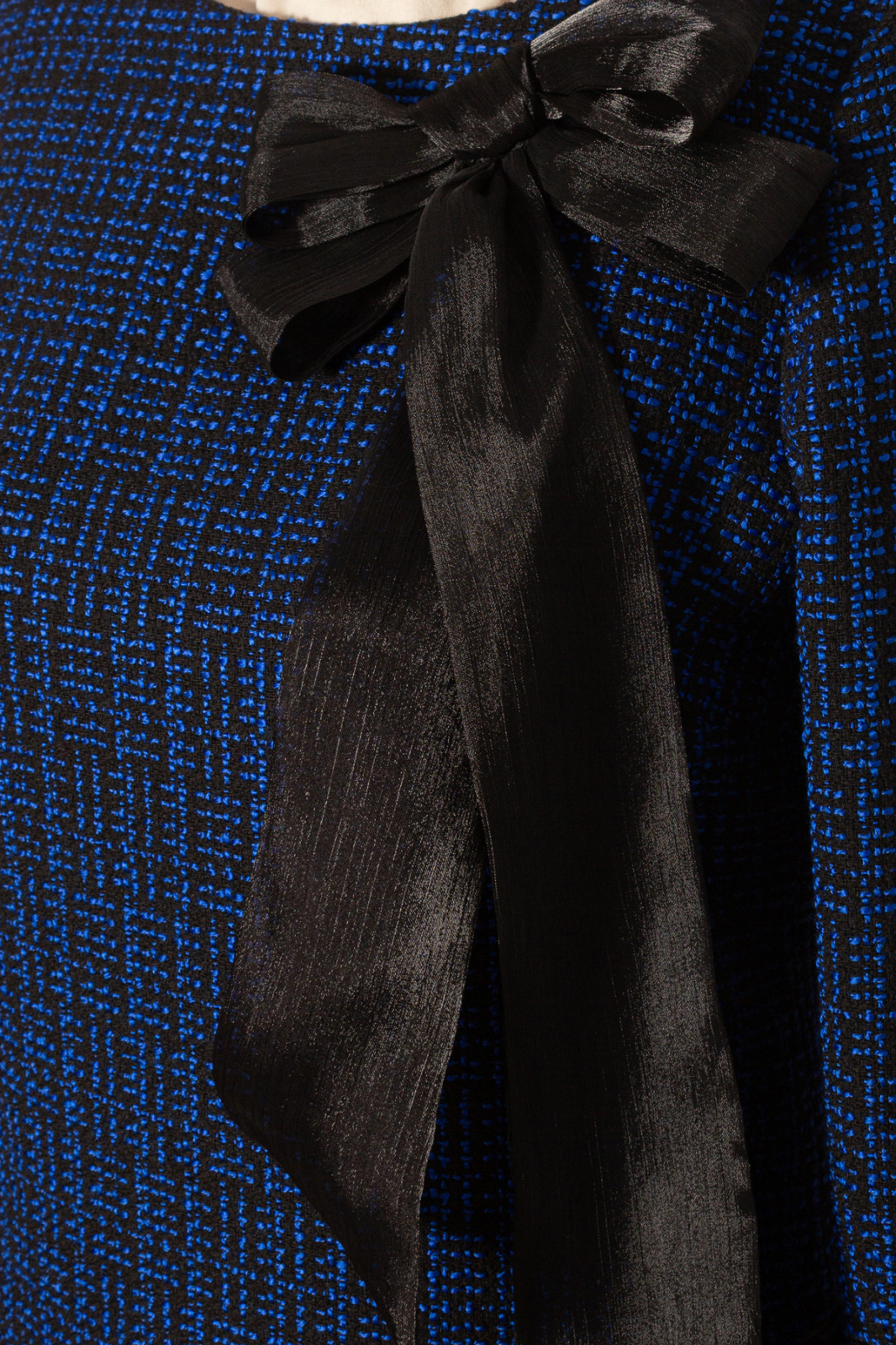 Rochie de zi dintr-un tweed texturat in nuante de albastru si negru cu croi ce urmeaza linia corpului, lungime midi, decolteu rotund, accesorizata pe bust cu o funda din organza, maneca lunga stilizata in terminatie, inchidere cu fermoar ascuns pe spate.