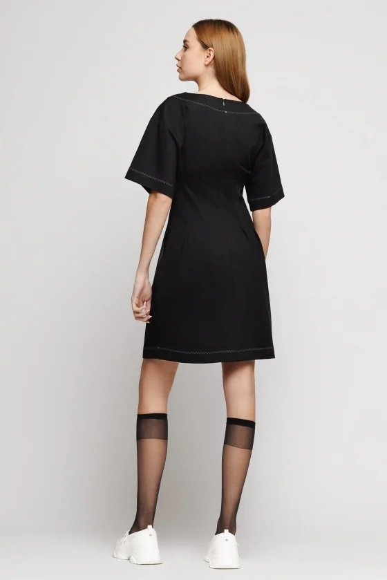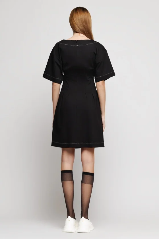 Rochie scurta din tesatura tricotata uni, cu plii in fata, cusaturi in contrast si accesoriu din fas in contrast. Se incheie cu fermoar la spate.