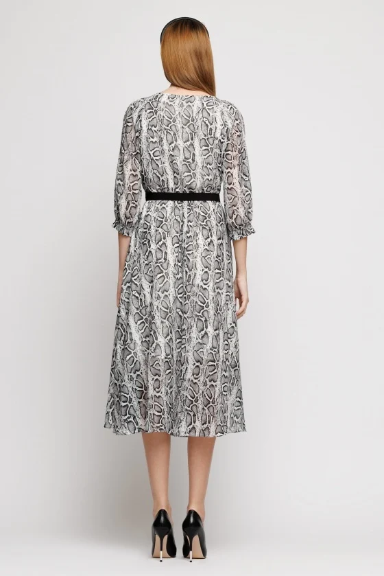 Rochie semiclos, din tesatura imprimata, cu maneci trei sferturi incretite cu elastic, plii la decolteu si curea din tesatura uni, in contrast.