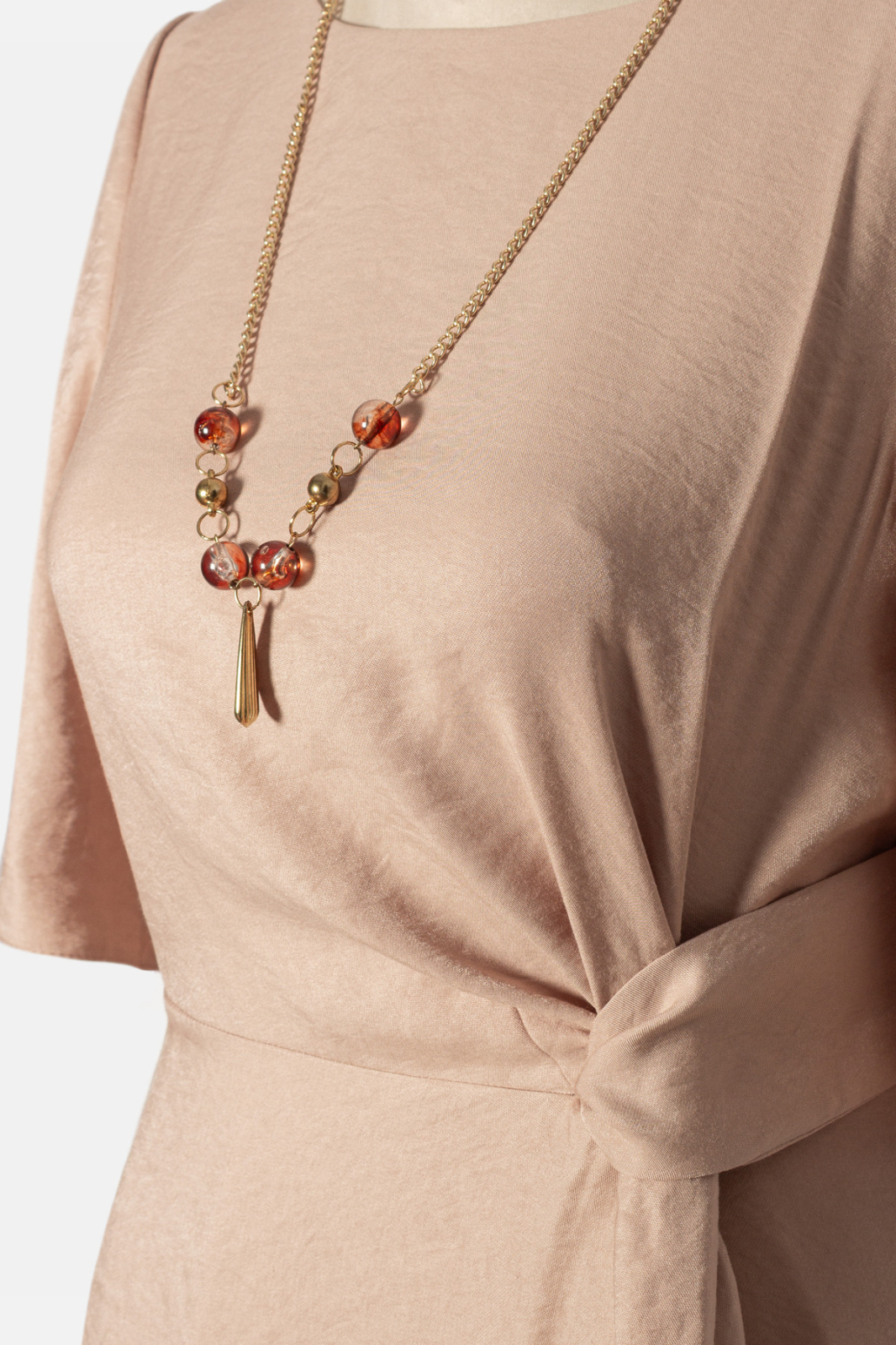 Rochie de zi din tesatura bej, de lungime medie, captuseala in ton, model in cos, decoletu rotund cu acesoriu tip lantisor, stilizata in talie, maneca scurta, inchidere cu fermoar ascuns pe spate.