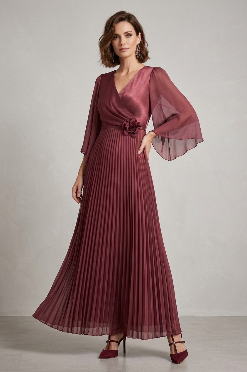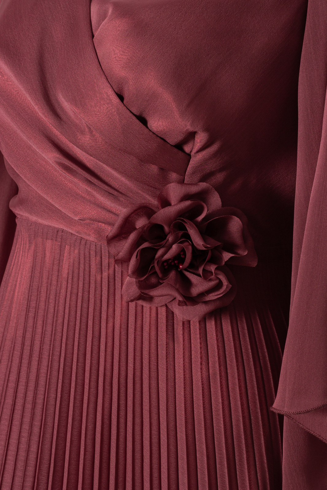 Rochie elegantă lunga din voal uni grena, captuseala in ton, decolteu in V parte peste parte, plisata pe partea de jos, accesorizata in talie cu o floare 3D ,mâneci trei sferturi lejere, fermoar ascuns pe spate.