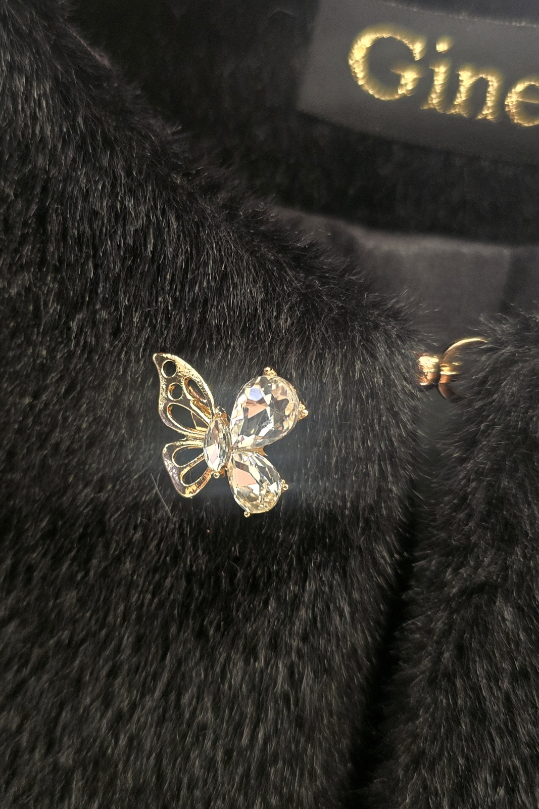 Sacou scurt din blana artificiala neagra cu brosa aurie. Inchidere in partea de sus cu sistem "mos/baba''.