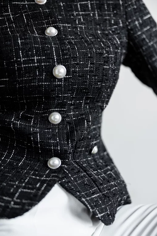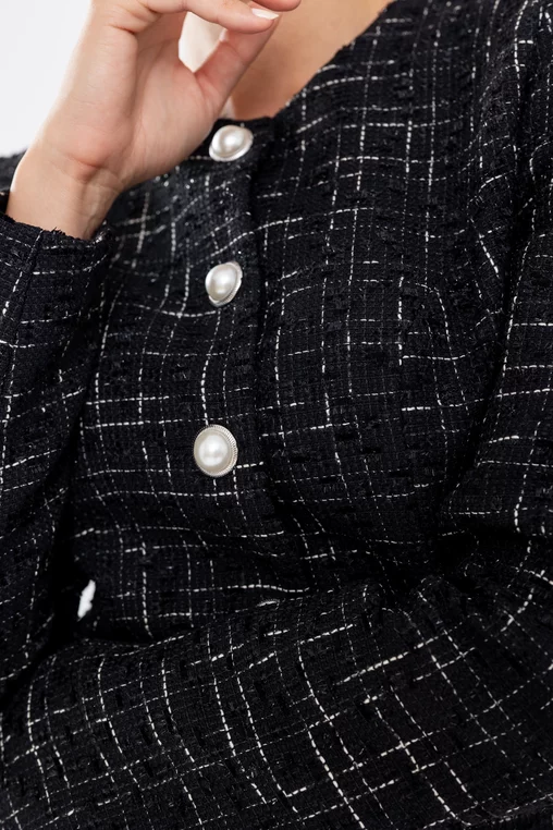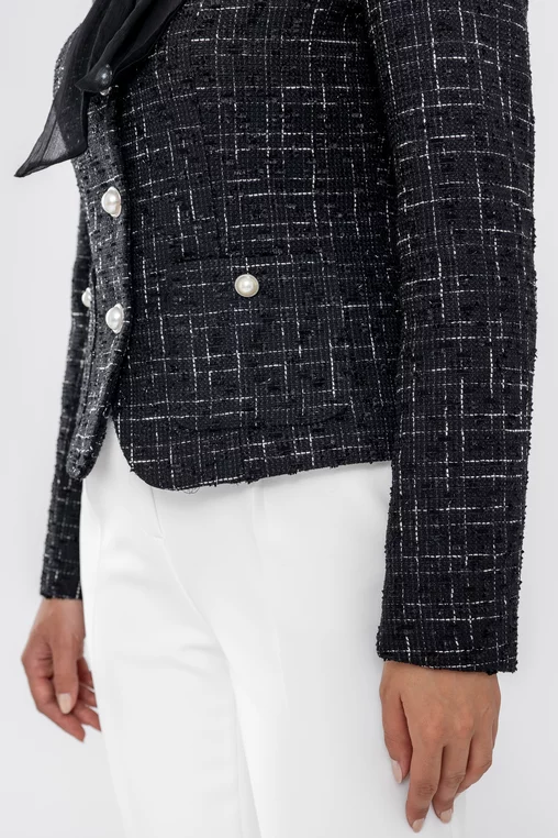 Un sacou elegant și modern, realizat din bucle groas cu fir lucios, ce oferă un efect sofisticat. Croiul cambrat avantajează silueta, iar detaliile precum buzunarele aplicate și nasturii tip perlă pe toată lungimea adaugă rafinament. Fără revere și cu mâneci lungi, este piesa versatilă care completează perfect atât ținutele de ocazie, cât și pe cele office sau casual chic.