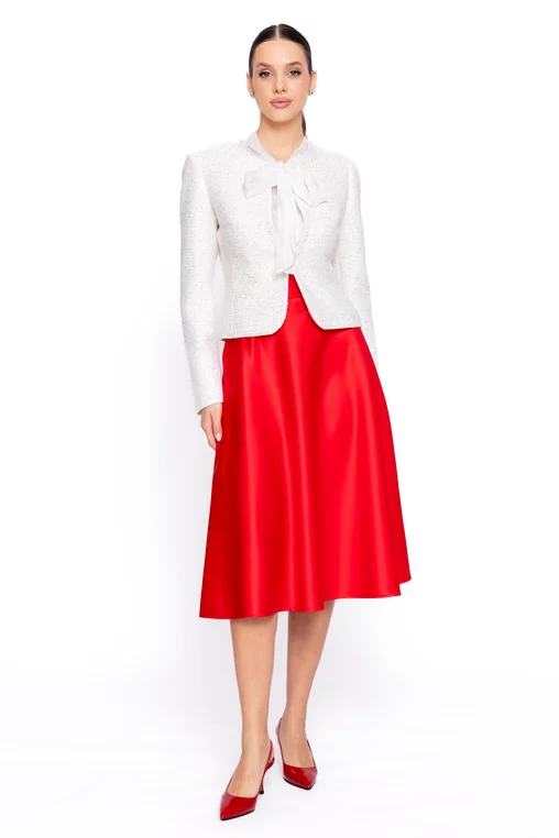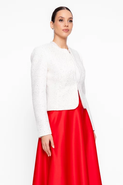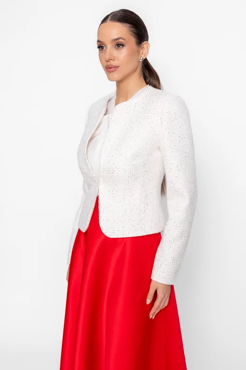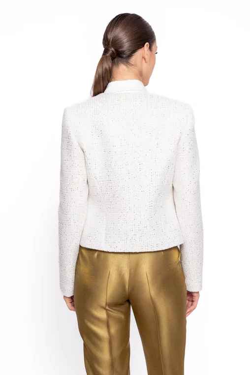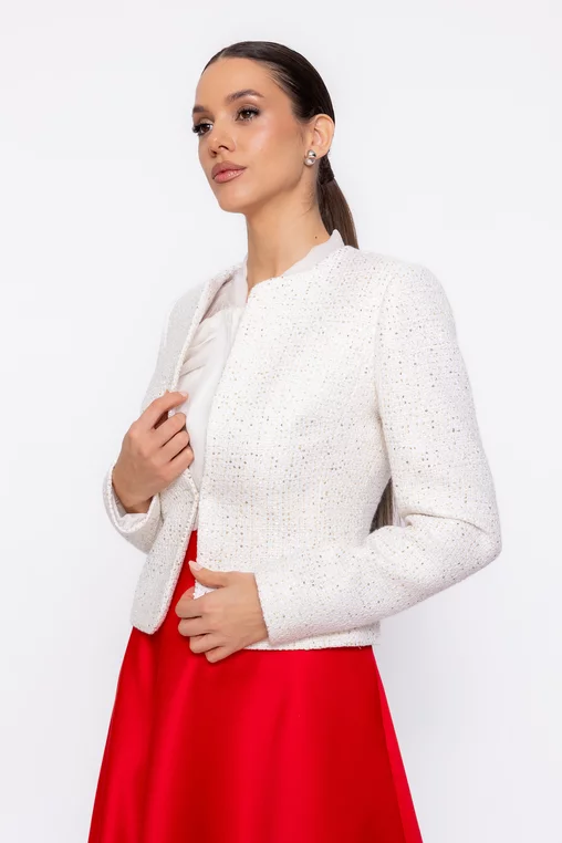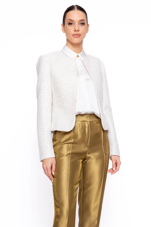 Adaugă un plus de rafinament ținutelor tale cu acest sacou elegant de damă, realizat într-o croială ușor cambrată ce evidențiază delicat silueta. Designul modern, fără revere, oferă un aspect curat și sofisticat, potrivit atât pentru stilul office, cât și pentru apariții speciale. Modelul este prevăzut cu mâneci lungi și se închide cu moș și babă, asigurând o fixare discretă și confortabilă. Materialul este accesorizat cu paiete aurii discrete, care adaugă o notă subtilă de eleganță și strălucire, fără a încărca vizual ținuta. Versatil și ușor de asortat, acest sacou cambrat de damă se potrivește perfect atât cu pantaloni eleganți, cât și cu fuste sau rochii, fiind alegerea ideală pentru un look feminin, modern și bine definit.