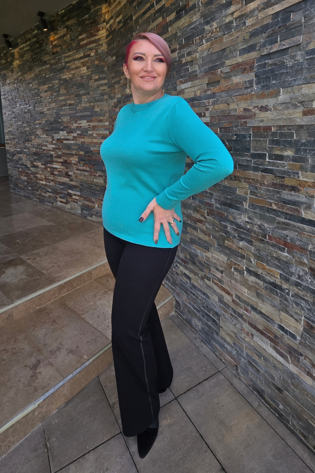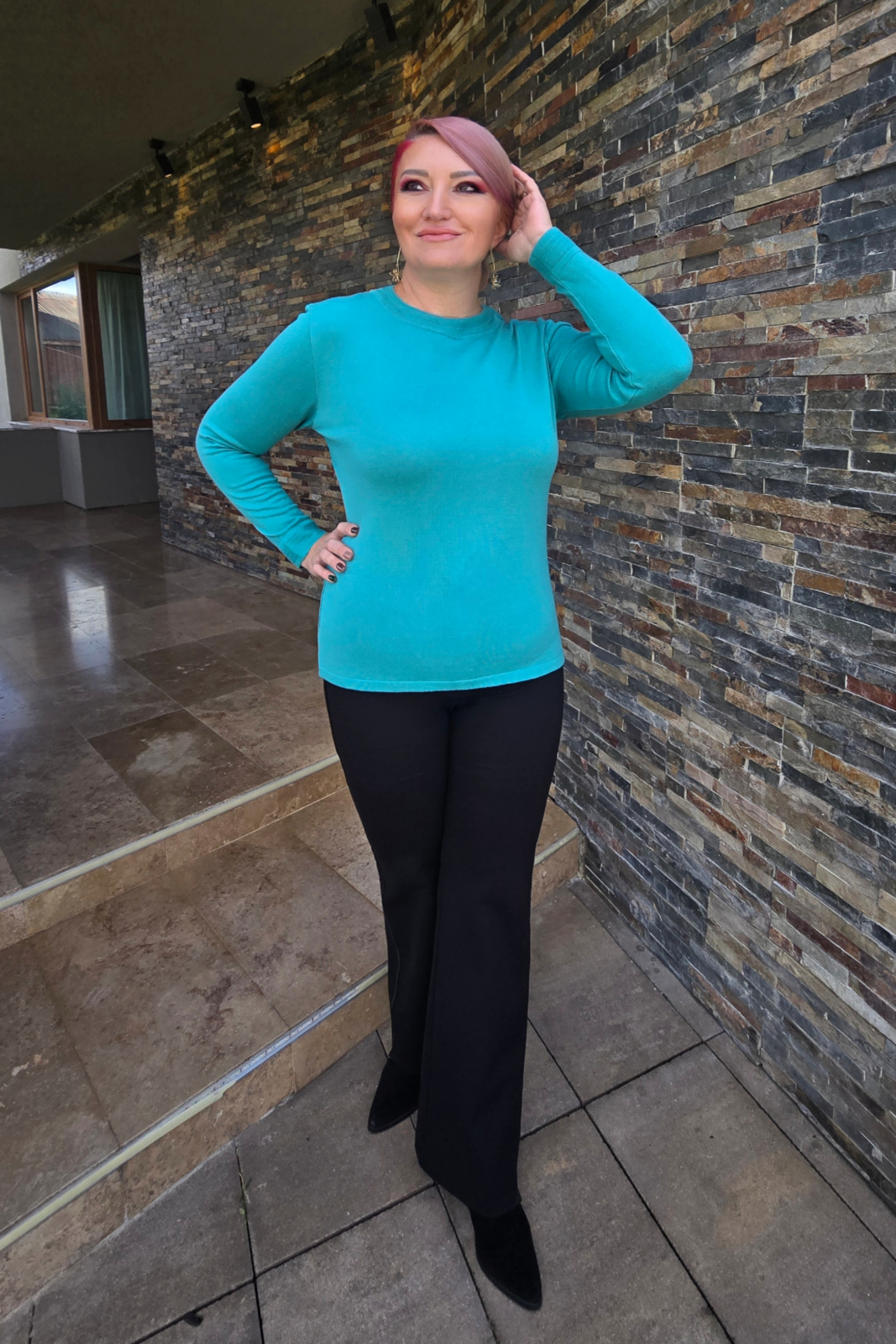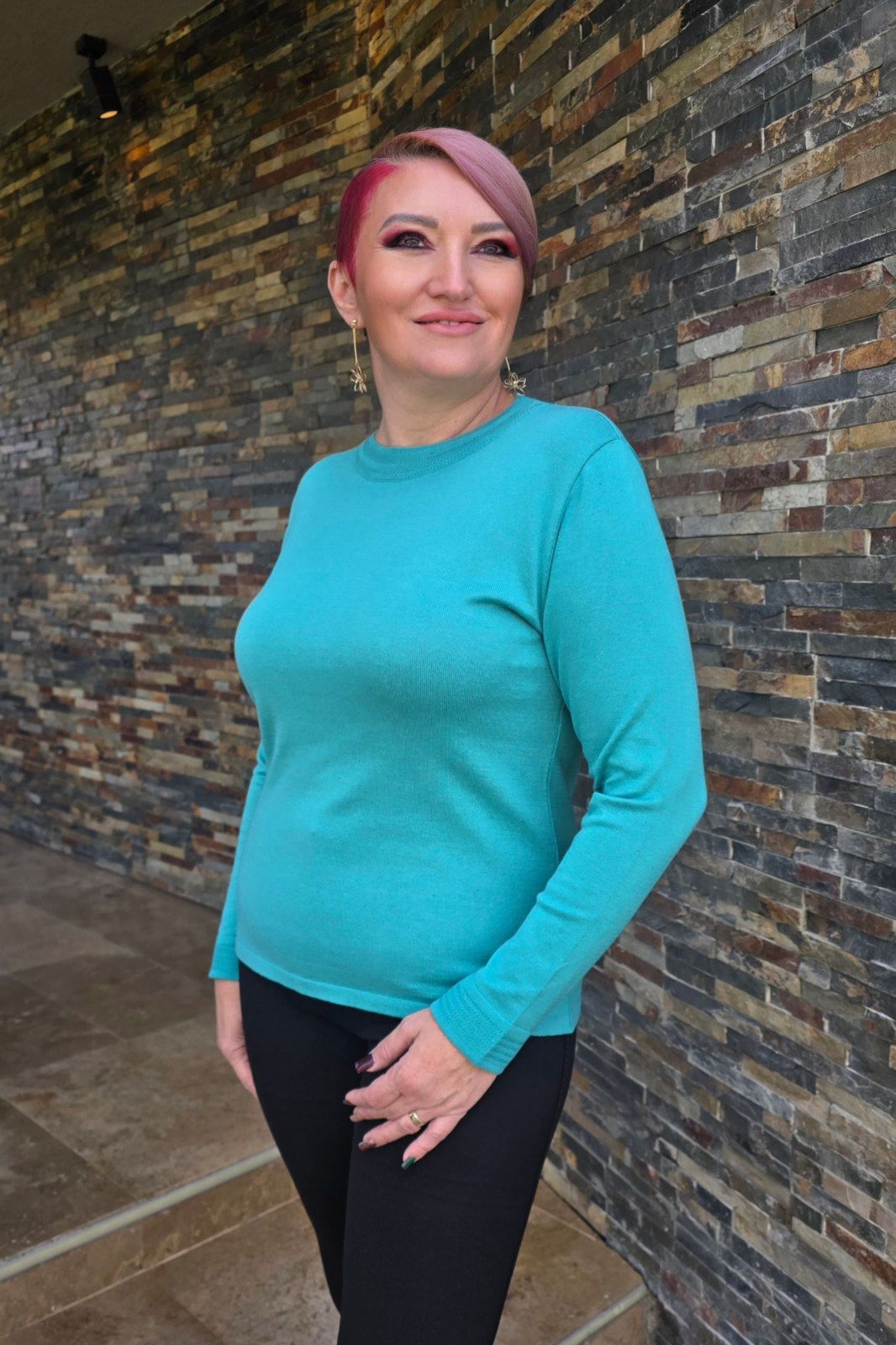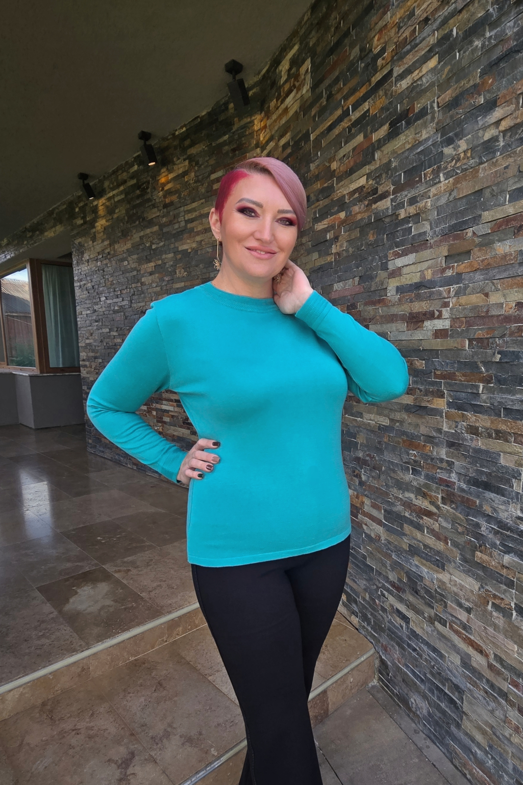 Pulover subtire din bumbac cu acril. Decolteu rotund la baza gatului.