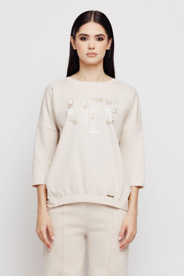 Tricou lejer din tesatura tricotata uni, cu terminatia asimetrica, fata incretita cu elastic si print cu paiete pe piept.